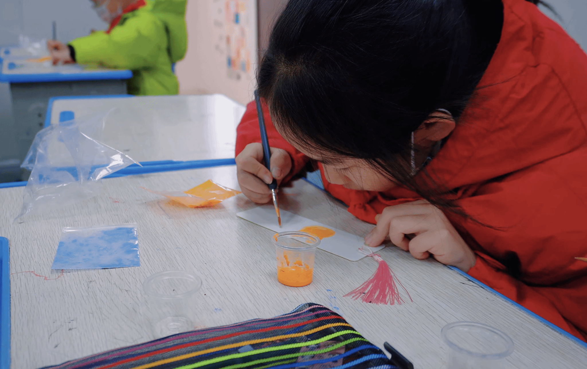 课堂不仅限于观看与聆听。在“矿物颜料制作”环节中,孩子们亲手操作:使用研钵研磨赤铁矿,过筛获取矿物粉末,使用专业岩彩胶调胶,制作矿物颜料,绘制自己独一无二的矿物岩彩书签。通过一系列生动有趣的亲手实践,同学们不仅体验到了古人绘画的乐趣,还第一次发现原来身边那些看似普通的石头,竟蕴藏着丰富的价值与用途。