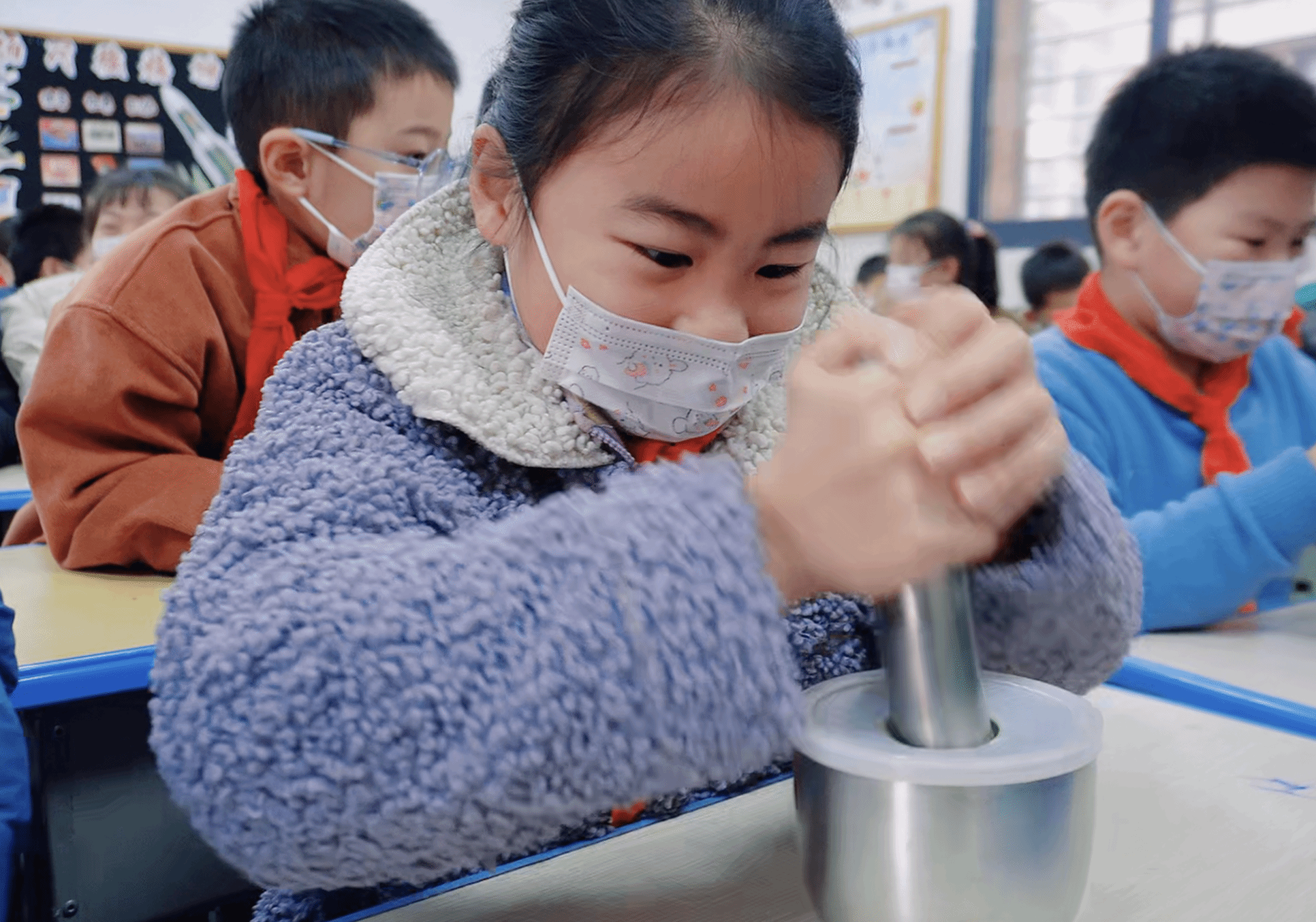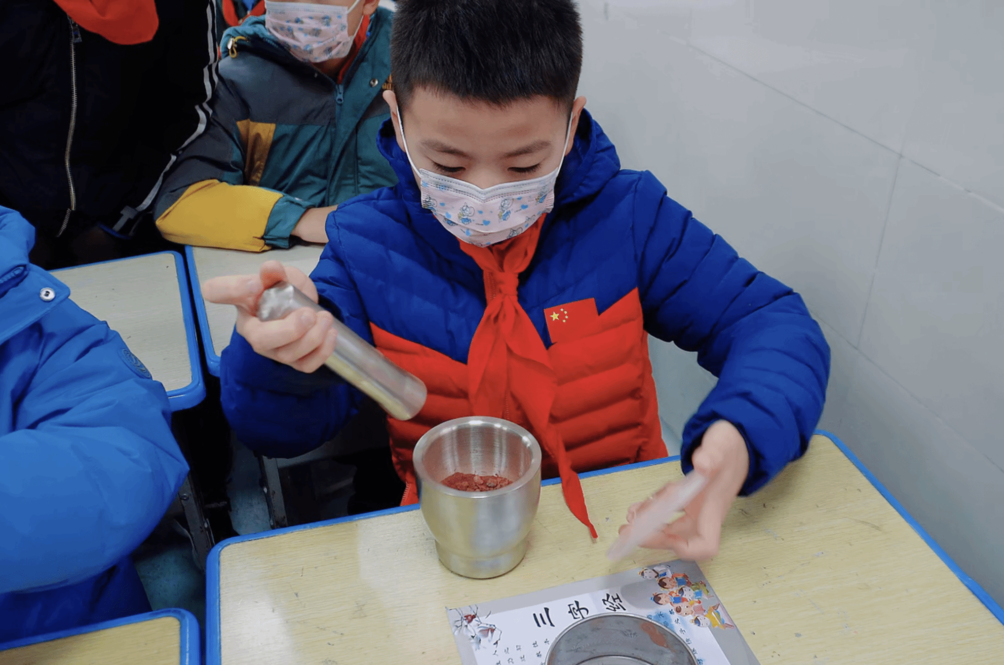 “大家说说看,《千里江山图》上面用到了哪些颜色呀?谁知道绿色是用什么矿物做的么?”在附属小学的教室里,来自辖区商户的授课老师正引导着孩子们发现色彩与矿物的关联,向孩子们娓娓道来地球的奥秘。同学们在互动中了解不同种类矿石的生成环境,以及矿物可以制作出的颜料,惊叹声此起彼伏。
