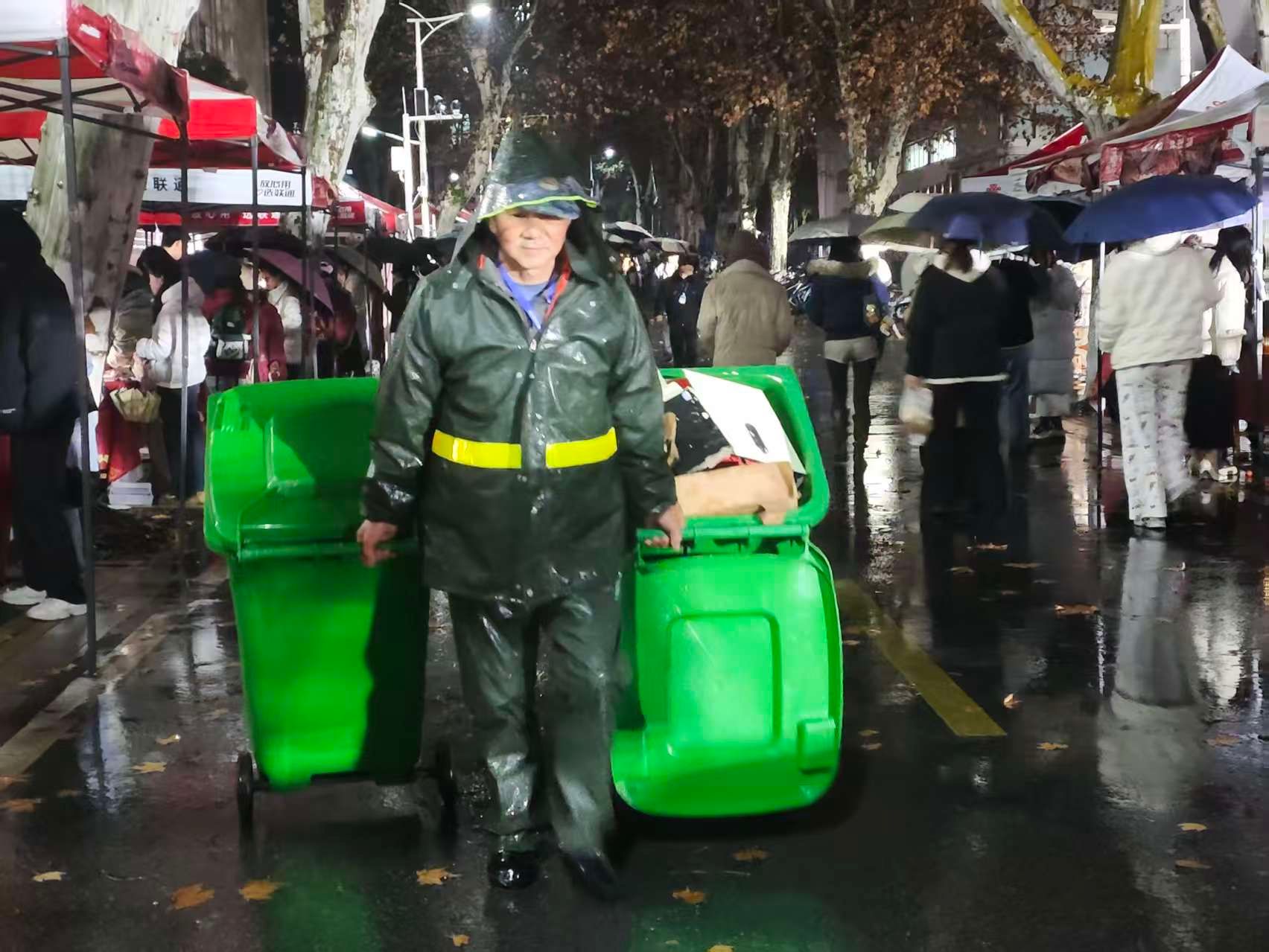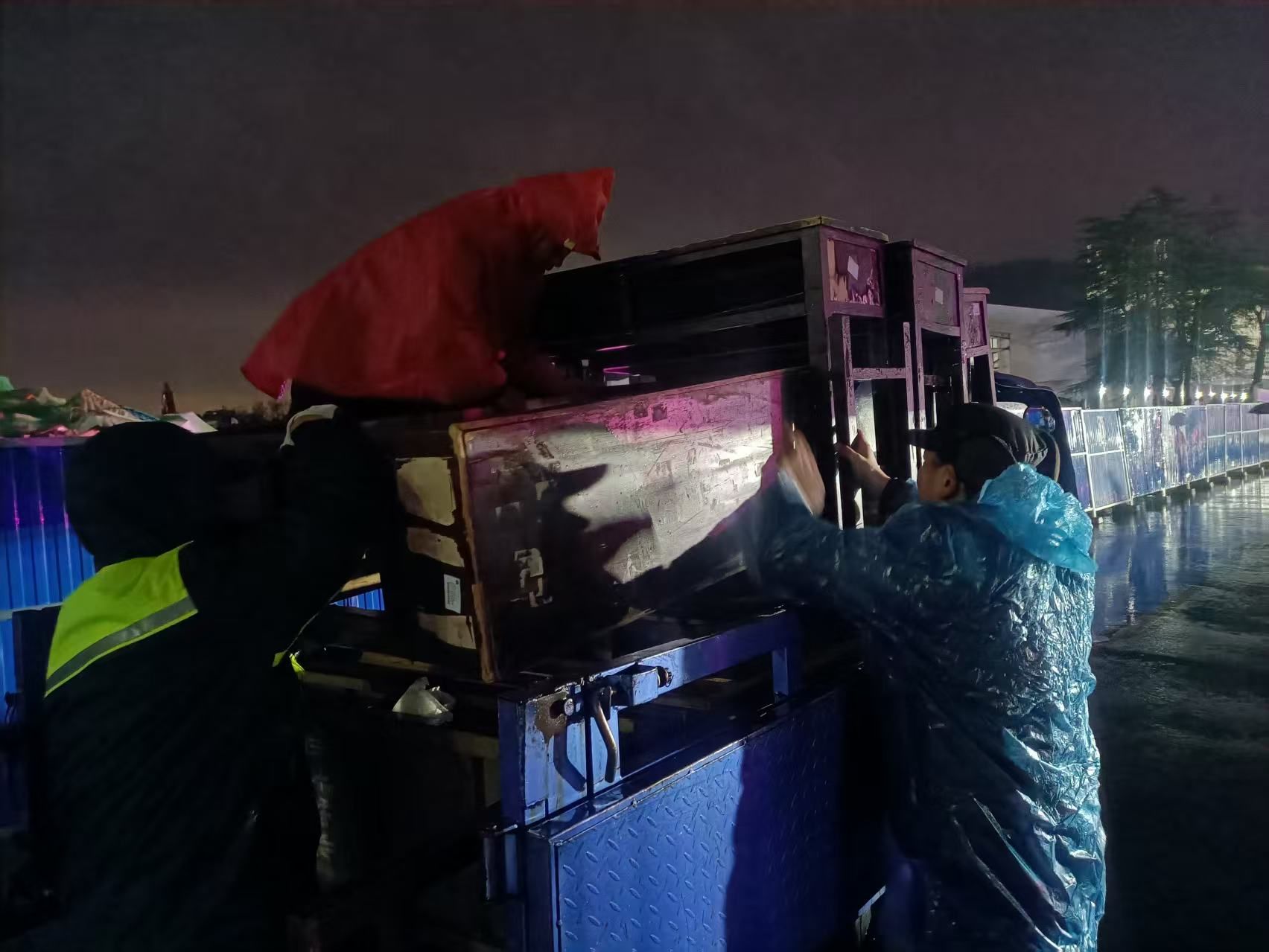 活动期间,保洁团队实行“流动巡查制”,重点保障弘毅堂、西区体育馆门口等人员密集区域的路面卫生,及时清运垃圾,确保场地整洁。活动结束后,部门员工克服严寒与疲惫,持续工作至凌晨1:30,全面清理了活动区域的垃圾杂物,使校园环境在最短时间内恢复了原貌。