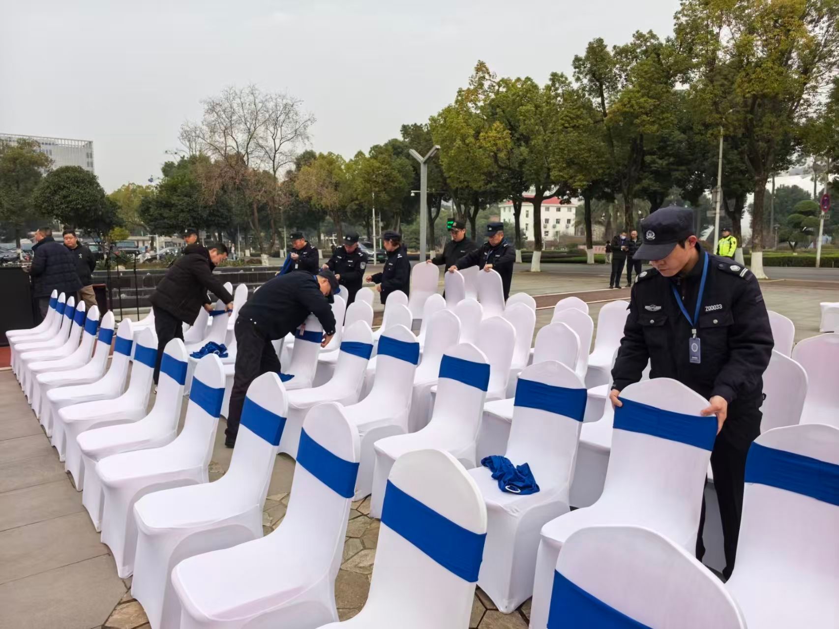 在元勋群像雕塑落成仪式筹备期间,物业服务中心将环境美化与氛围营造作为工作重点。为确保仪式现场庄重整洁,工作人员提前三天对周边区域进行精细化保洁,重点清理地面杂物、冲洗污渍,并对绿化带内的灌木进行了统一修剪,确保景观层次分明、绿意盎然。12月30日仪式当天,巡查组全员提前两小时到场,高效完成了140把嘉宾座椅的摆放与椅套铺设工作,为仪式的顺利举行奠定了坚实基础。