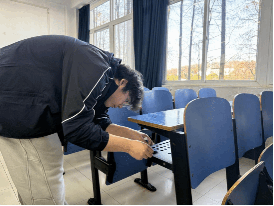 此次活动不仅着眼于环境清洁,更将校园安全理念融入实践环节。针对部分课桌桌洞存在孔洞易导致手指误入的安全隐患,物业工作人员指导志愿者逐间教室、逐张课桌进行细致排查,准确定位问题后及时粘贴醒目的安全提示标语,以消除潜在风险。