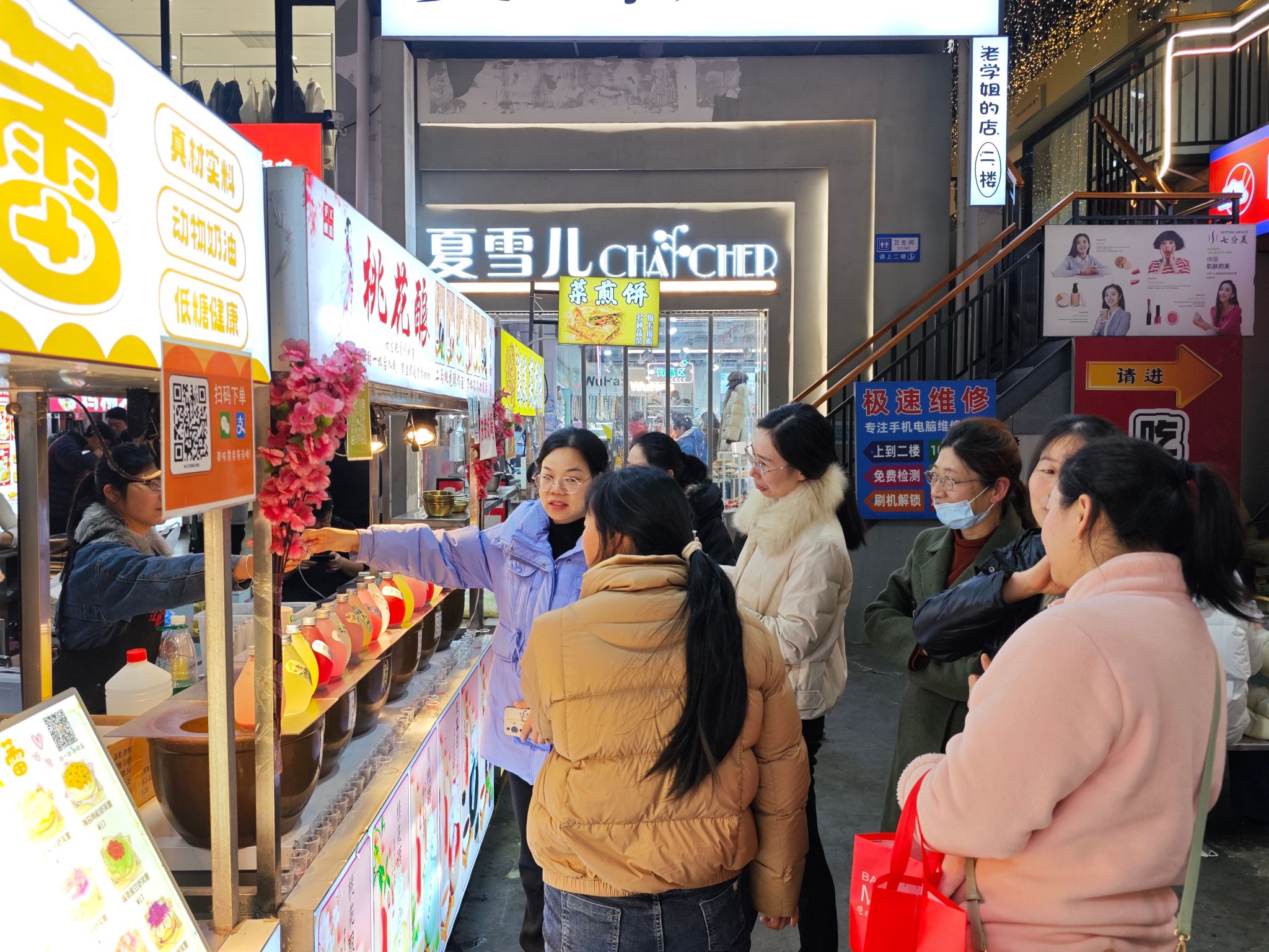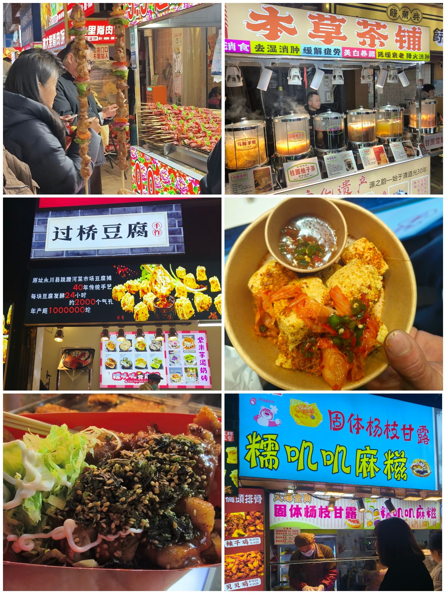 冬日傍晚,美食街上灯光渐起,炊烟袅袅中弥漫着诱人的香气。考察团队穿梭于熙攘人群中,目光细致地掠过每一个摊位:“过桥豆腐”嫩滑沁香,“糯叽叽麻薯”绵软弹润,“吊锅”热气蒸腾,“黄石土豆片”酥香诱人,“手工珍珠奶茶”茶韵醇厚,“茄盒”外脆内鲜……一道道市井美味,不仅触动味蕾,更引发大家对食堂菜品创新的思考。