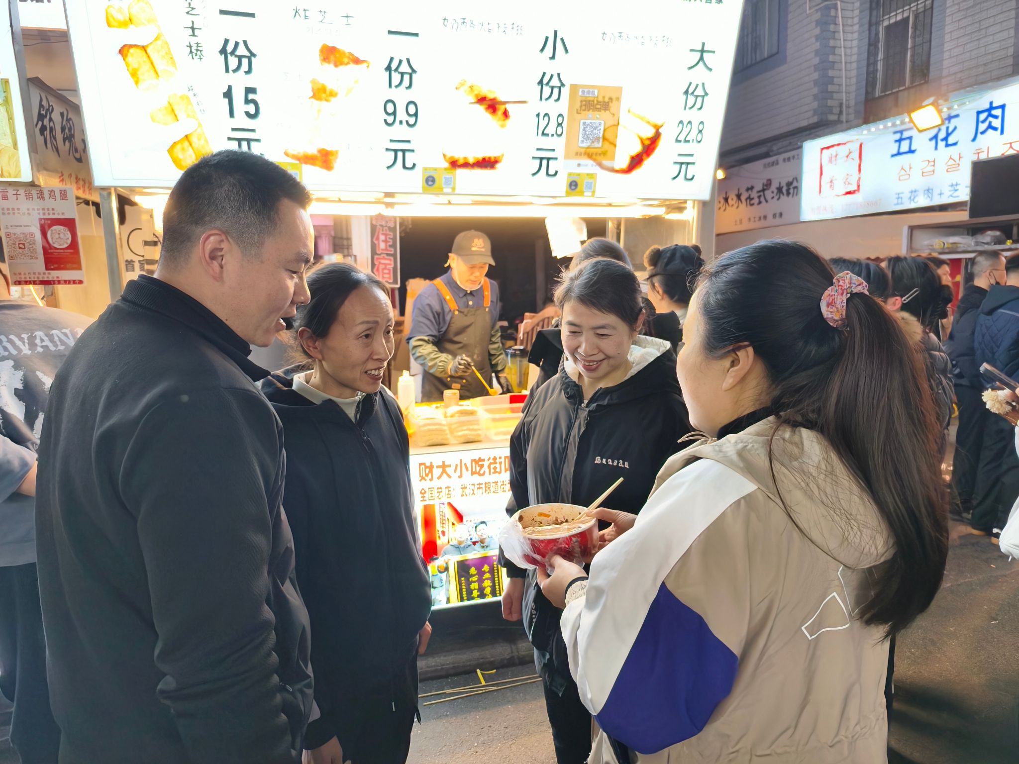 寒假前夕,校园渐归宁静,饮食服务中心的服务创新步伐却愈发紧凑。近日,各食堂经理、厨师长带领骨干团队,走进财大小吃街、万松园雪松路、水塔街、江夏夜市等武汉热门美食聚集地,开展了一系列“接地气、品烟火、寻新意”的菜品调研活动,为新学期丰富餐盘滋味、提升餐饮服务品质提前谋篇布局。