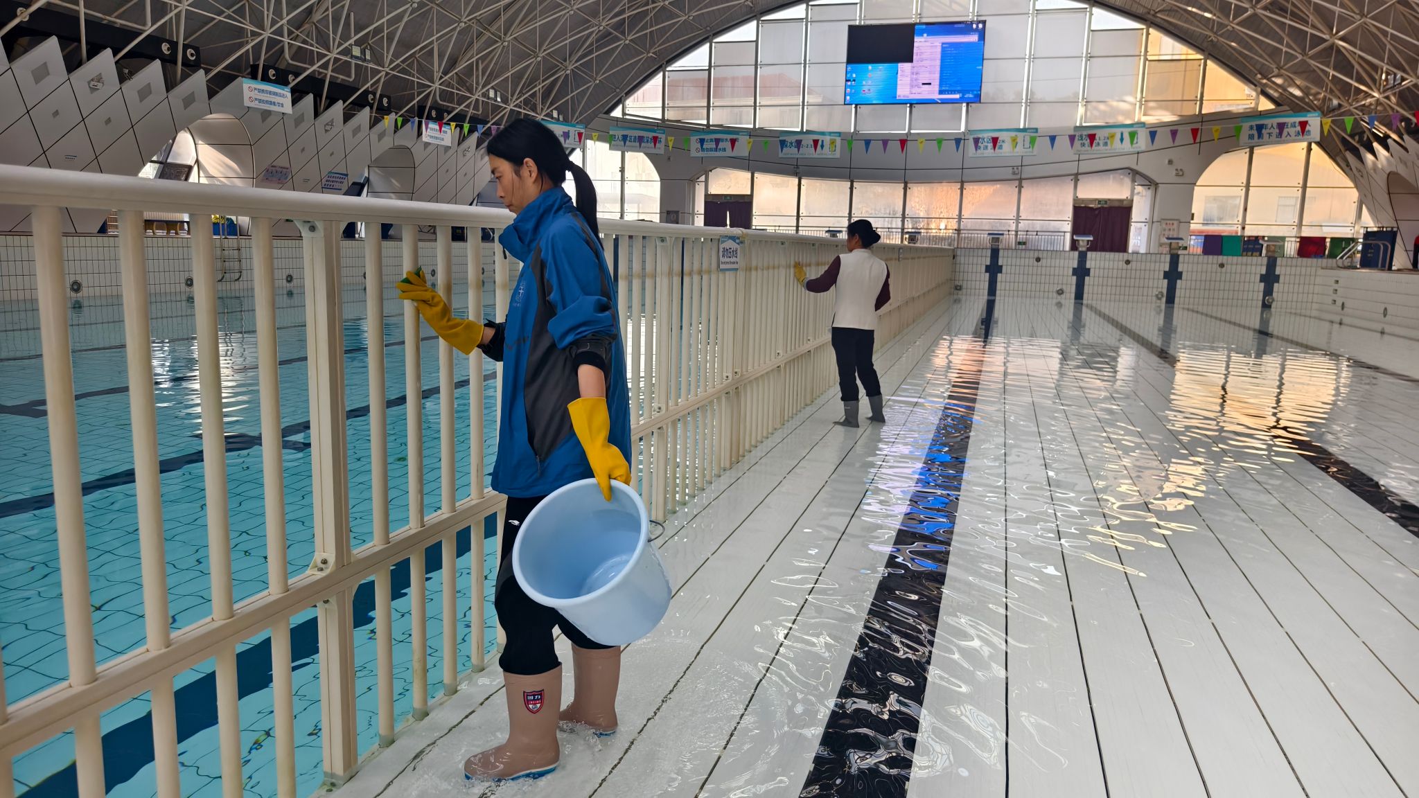 开展池区深度清洁,更换破损瓷砖,打磨瓷砖表面凸起尖锐处,彻底消除安全隐患。池区400块垫层逐一拆卸、清洗、晾晒,对部分松动垫层支架进行加固,增强其承重与防滑性能。对馆内389组更衣柜、30条休息长凳进行表面擦拭与深层消毒;淋浴区域开展系统性清洁工作,包括排水沟清淤、隔板刷洗、喷头除垢、淋浴杆抛光,同时更换部分老旧防滑垫,全方位预防湿滑风险。场馆外围玻璃全面清洗,进一步提升环境通透感。