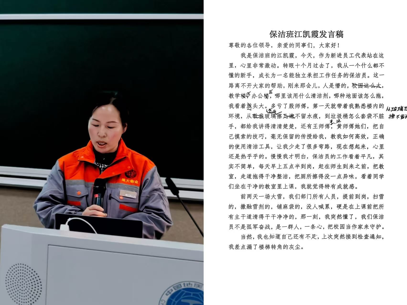 岁序更替,华章日新。正值学校复盘过往成效、锚定十五五规划蓝图、谋划高质量发展的关键阶段,物业服务中心近日召开年终总结大会,在员工代表发言环节,来自环卫绿化、保洁、秩序维护等不同岗位的员工代表,立足日常工作实例,用最朴实的话语、最真挚的情感,讲述扎根岗位、默默耕耘的服务故事。