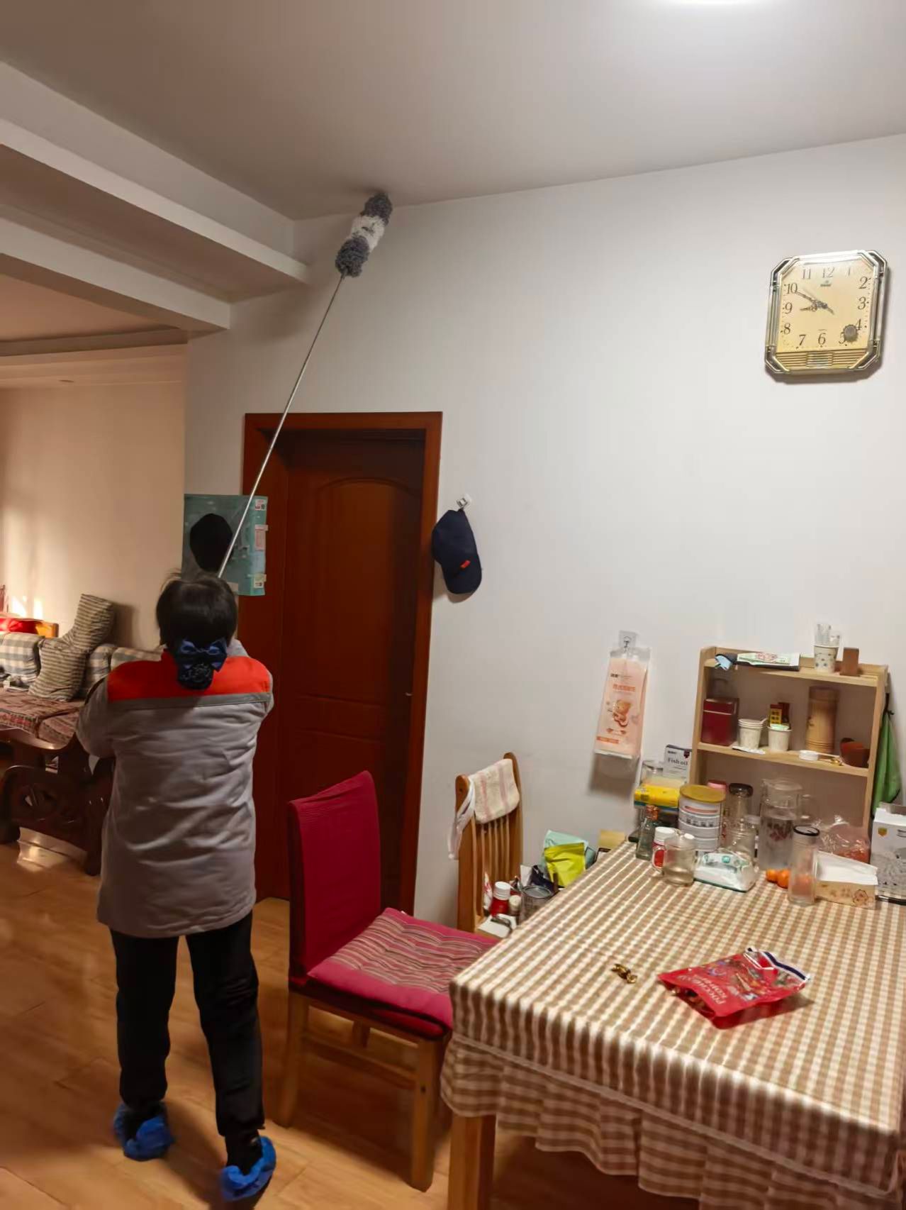 服务现场,工作人员分工协作、默契配合,没有丝毫懈怠,始终秉持“细致、周到、贴心”的原则,用双手传递温暖,用实干诠释担当。客厅里,他们弯腰擦拭地面、认真打理家具,不放过任何一个角落的灰尘;卧室中,他们细心擦拭门窗、整齐摆放物品,用细致守护老教师的舒心起居;厨房里,他们耐心清理油污、擦拭灶台橱柜,还原整洁清爽的烹饪环境;卫生间、阳台上,他们认真清扫、规范整理,每一个动作都饱含温情。作业过程中,工作人员严格恪守服务规范,时刻尊重老教师的生活习惯,未经允许绝不随意挪动贵重物品,高层窗户清洁时,全程采用长杆工具作业,并安排专人全程监护,全力确保操作安全。