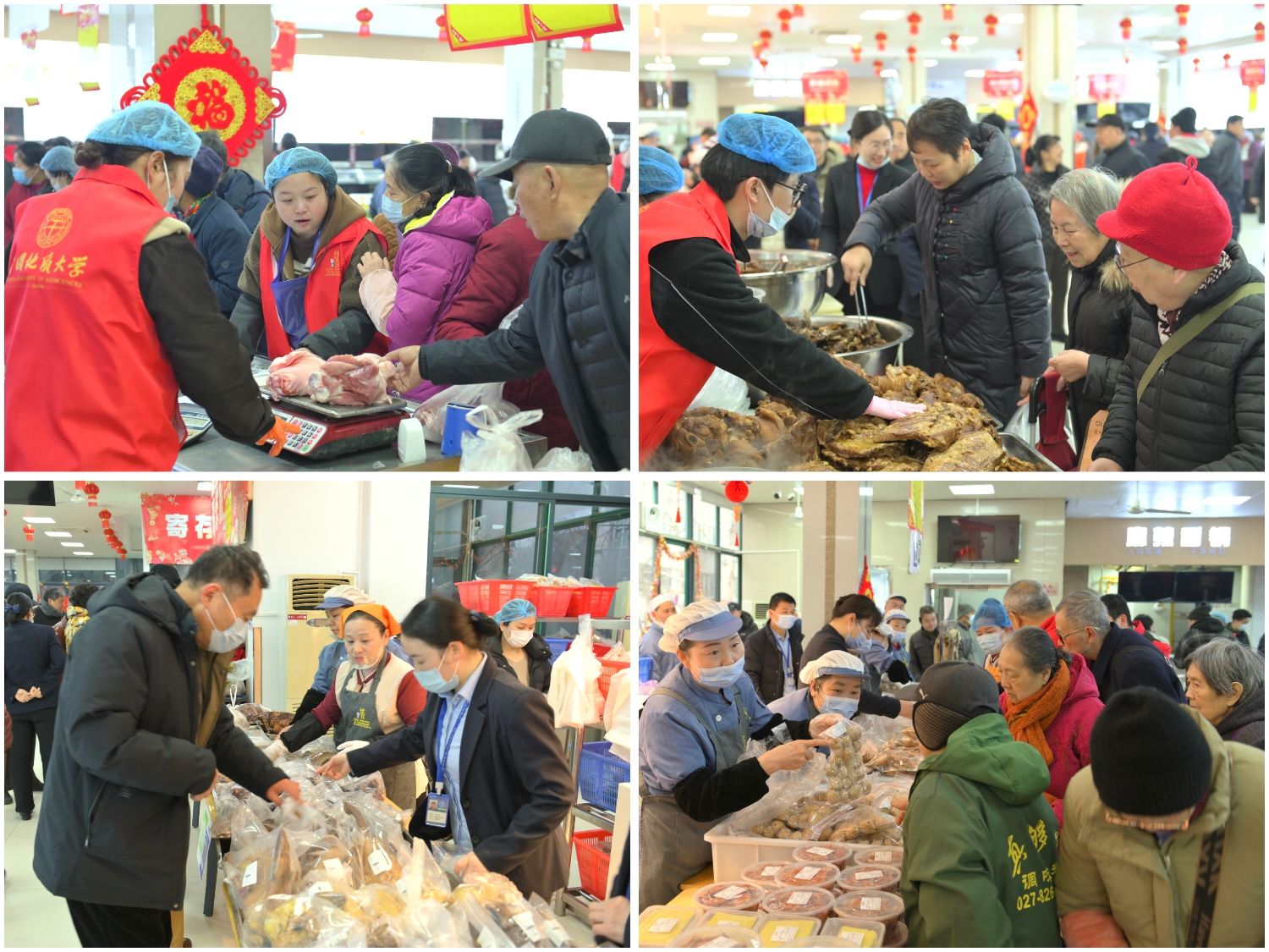 红灯笼挂起新春的序曲,展台上铺展丰盈的年光。我们汇集经典与心意——从基础所需的粮油蔬菜、禽蛋冻品,到师傅手工现制的腊味、蒸菜、卤味与炸货;从源头直采的通山黑猪肉、宁夏滩羊等特色肉品,到合作农场的生态茶饮、天然蜜……每一份选择,皆承载后勤人的细致遴选与真诚。今年继续延续“平价直供、惠馈师生”的原则,让满载的年货,亦满载心安。