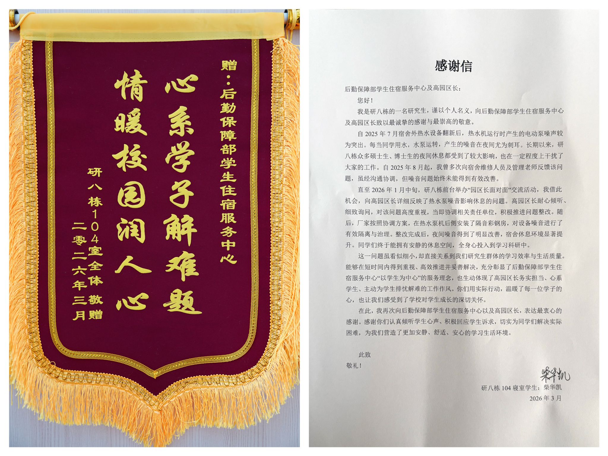 “终于能拥有安静的休息空间,全身心投入学习科研了!” 送锦旗时,同学的话语里满是对学校后勤服务的认可与感激。