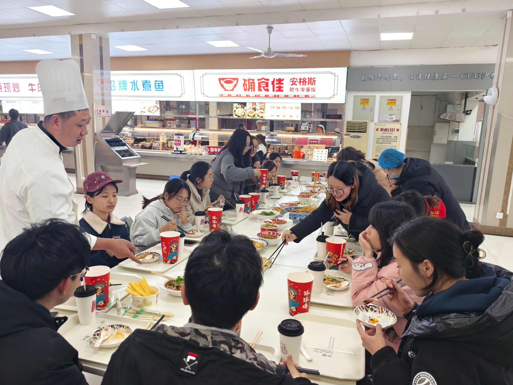 次日,北区食堂接力举办试吃会,邀请16名学生代表参与。肠粉档口的鸡蛋培根肠粉与手工鲜肉蒸饺热气腾腾,长沙码子粉的土豆鸡蛋饼金黄酥脆,面夫子的牛肉锅贴香气扑鼻;主食方面,肥牛肥汁米线汤汁浓郁,中原风味的蒜汁捞面与油泼干板手工水饺风味地道,亦鱼亦饭的酸辣鸡杂拌饭、嗨族拌面的椒麻鸡拌面酱香浓郁,襄阳牛肉面的砂锅土豆牛腩与黄焖鸡肉饭更是令人食指大动。品鉴间隙,水果捞的杨枝甘露清甜解腻,兜仕茶的幽兰暮雪茶香悠长,为这场美食盛宴增添几分惬意……南北风味汇聚一堂,琳琅满目的新品引得同学们连连称赞。