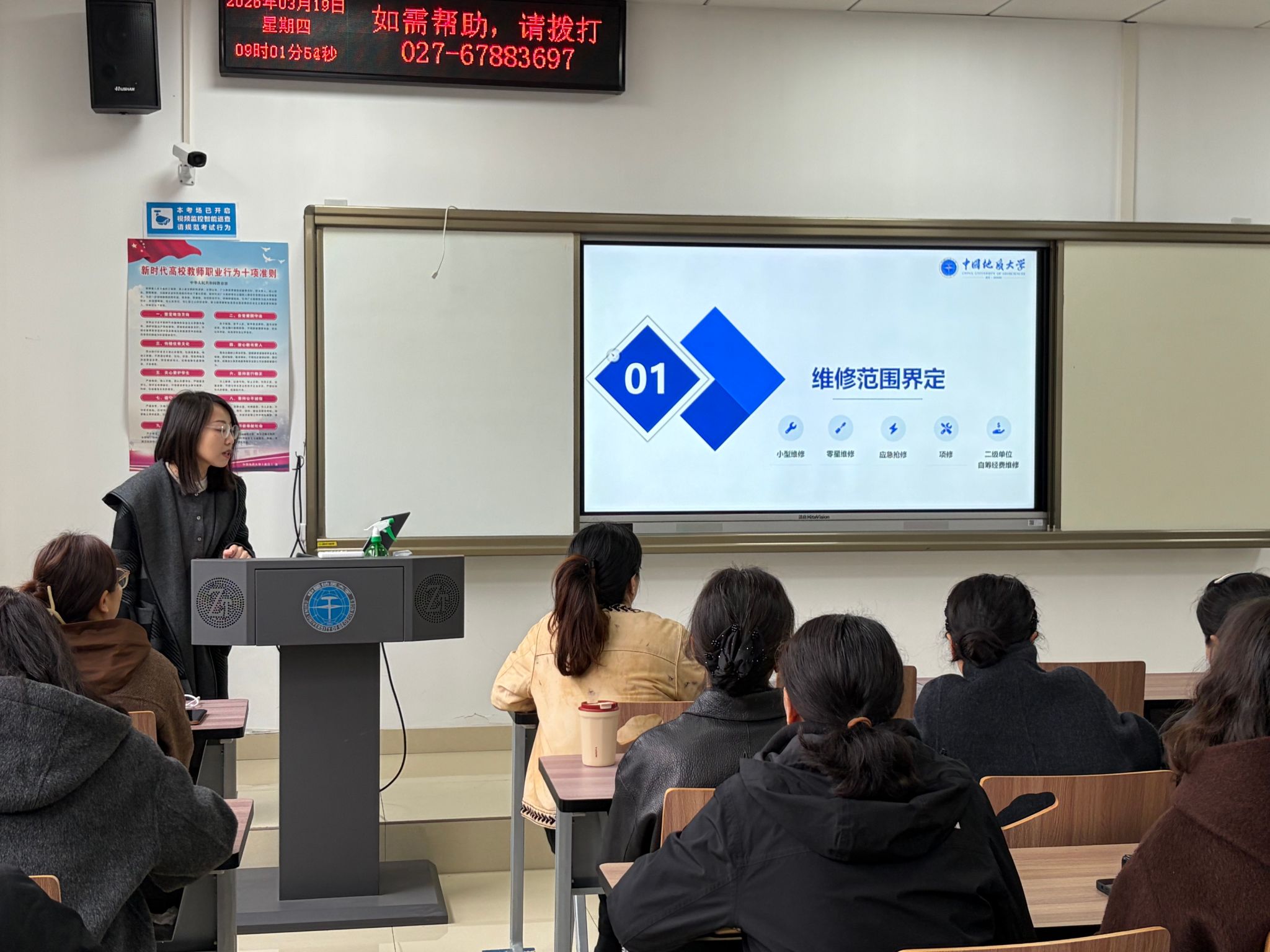 为进一步规范采购管理流程,提升校园维修服务效能,3月19日,物业服务中心组织开展采购流程细则与维修工作专题讨论会。讨论会由中心党支部书记江琼主持,综合协调服务部相关负责同志担任主讲。