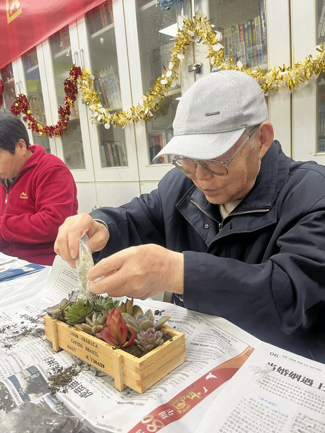 反诈宣讲结束后,温馨的生日庆典正式开启。多肉绿植种植手工环节率先登场,在志愿者的专业指导下,老人们兴致满满地动手培土、栽苗、装饰花盆,精心打造专属盆栽。小巧鲜活的多肉绿植尽显生机,大家相互交流种植技巧、分享创作喜悦,指尖绿意承载着满满的幸福感,现场氛围轻松愉悦。