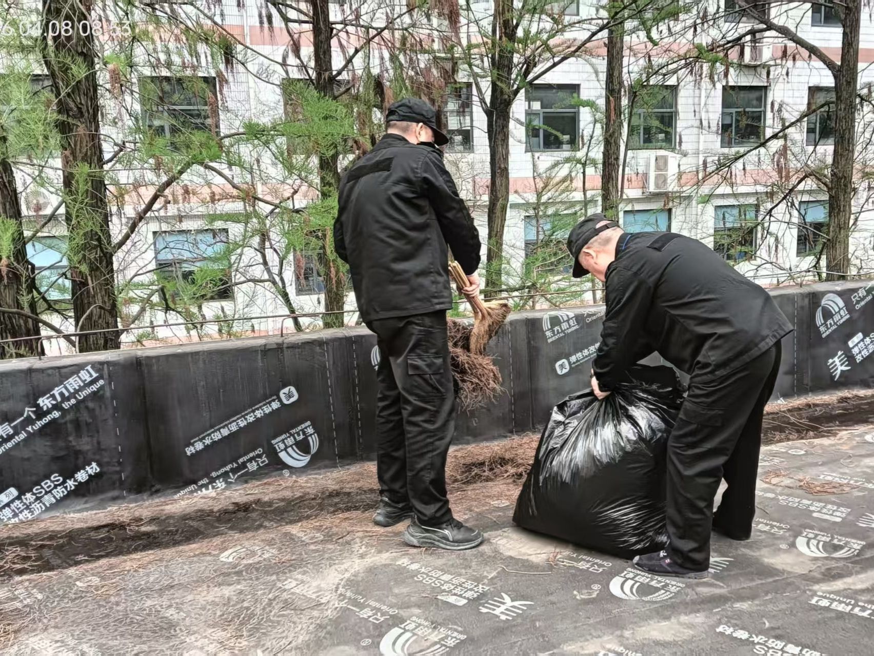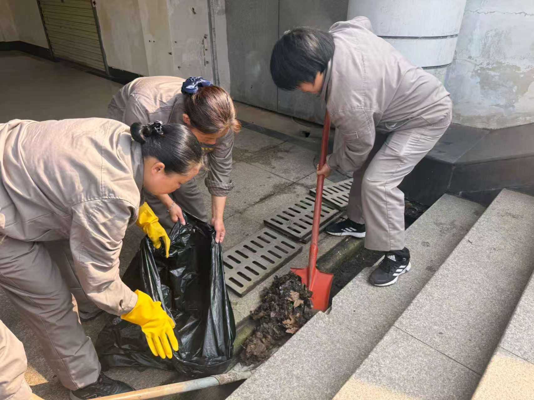 未雨绸缪,精准部署,筑牢防汛前置防线。汛情来临前,中心密切关注气象预警信息,第一时间召开防汛工作部署会,明确各岗位职责,细化应急处置流程。同时,主动向校园各保障单位送达防汛告知书,明确防汛责任,凝聚合力。启用无人机对所辖楼顶开展全方位巡查,排查楼顶排水口堵塞、积水隐患并组织人员进行全面清淤;细致清理公共区域明沟内的杂物、落叶和淤积泥沙,确保排水通道畅通;对东区幼儿园、柳池周边等积水区域的井盖逐一加装沙袋压实,防范暴雨冲击导致井盖移位、雨水倒灌,从源头降低防汛风险。对电梯机房、井道及底坑展开全覆盖隐患排查,重点核查渗漏、积水等风险点,确保防风、防雨、防渍水措施落实到位。同时,物业提前备足沙袋等防汛物资170余件,通知应急小分队成员处于待命状态,为高效应对持续暴雨天气做好充分准备。