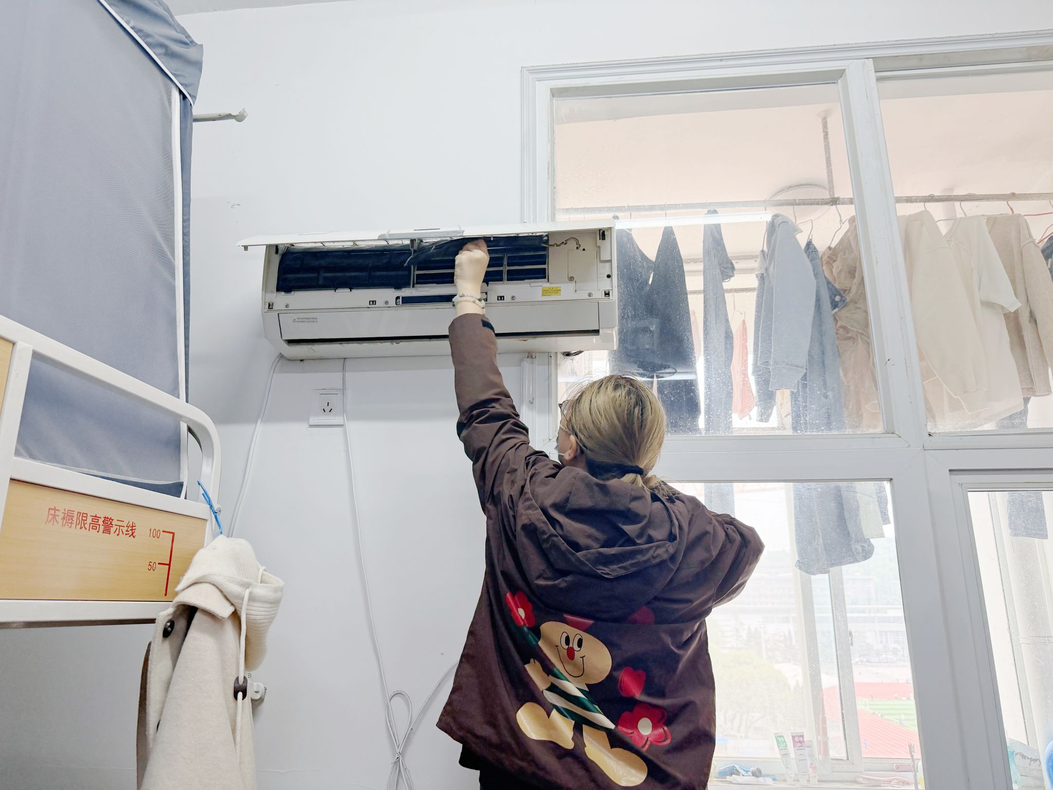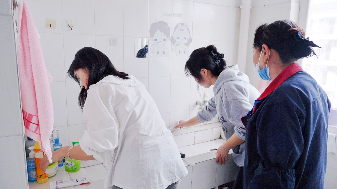 实操环节更是热火朝天。同学们回到各自寝室,保洁员一对一“手把手”指导,及时纠正不规范动作,耐心答疑解惑;园区长穿梭在各宿舍间维持秩序,保障活动有序推进。大家分工协作、互相配合,有的擦玻璃,有的刷厕所,有的拆洗空调滤网……短短一个半小时,原本藏污纳垢的卫生死角、积灰已久的空调,在同学们的巧手下一一变身,宿舍面貌焕然一新。活动最后,工作人员对所有参与宿舍的清洁成果逐一检查验收。不少同学表示,课程内容“接地气”、技能学得“用得上”,终于不再面对内务清洁一头雾水了。