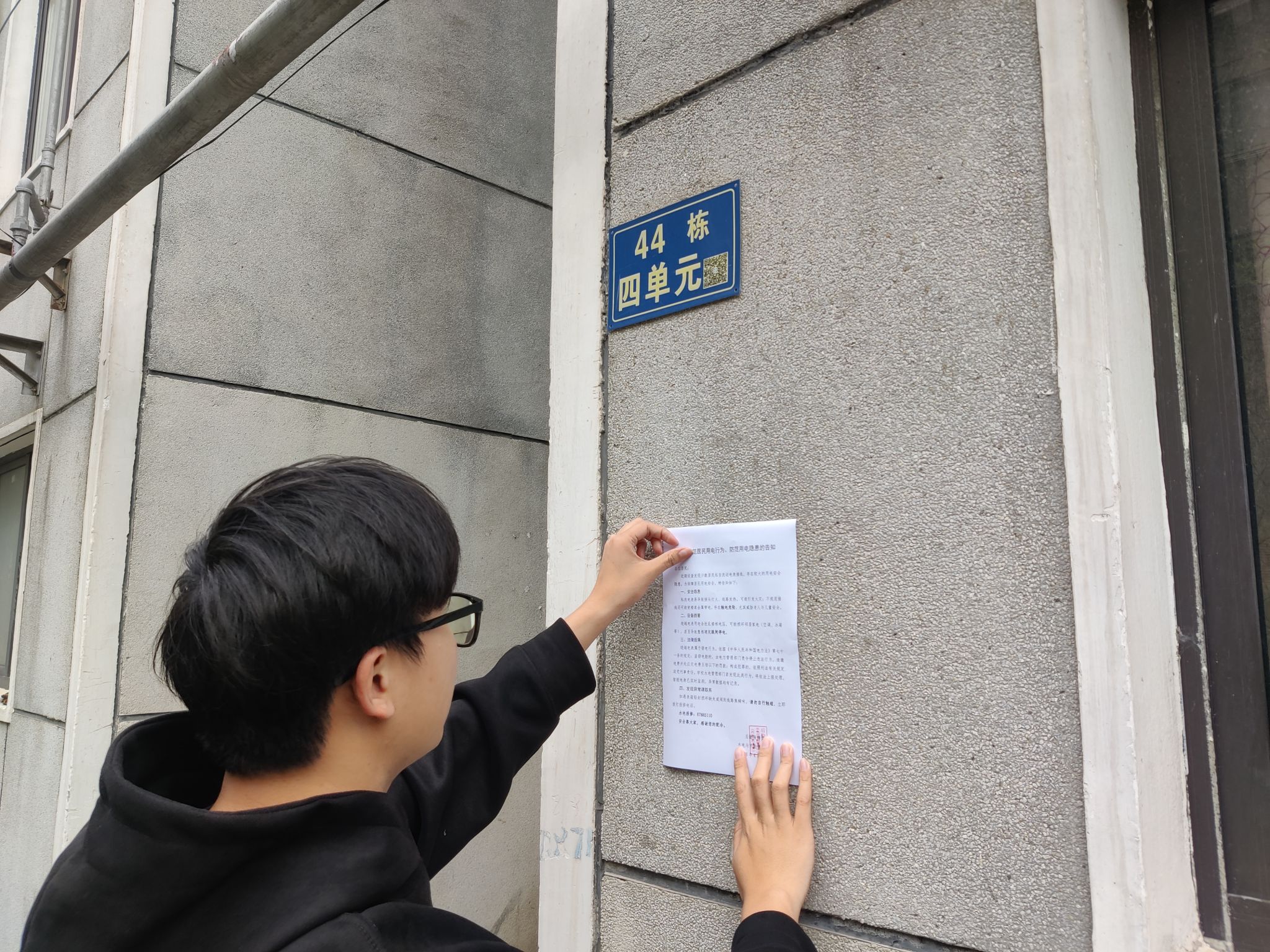 为切实履行校园水电安全管理职责,筑牢东区家属区的用电安全屏障,保障居民生命财产安全,4月16日下午,水电与节能管理中心组织工作人员深入东区家属楼,开展《关于规范居民用电行为、防范用电隐患的告知书》宣传张贴活动。