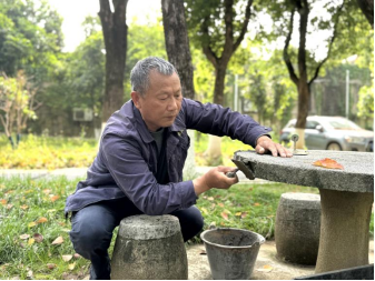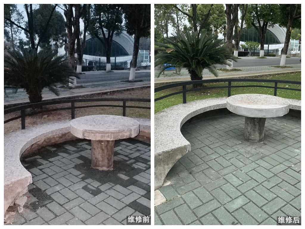 行动开展前,维修班组通过对全校户外石桌椅逐一排查,精准锁定桌面开裂、桌角缺损、石椅松动等问题,建立维修清单,量身定制解决方案。维修过程中,师傅们精准施策、高效作业:针对开裂桌面,选用同质石材严丝合缝替换;针对缺损桌角,采用水泥钢筋填补后精细打磨,恢复规整棱角;针对松动石椅,通过加固基座、填充缝隙全面稳固。
