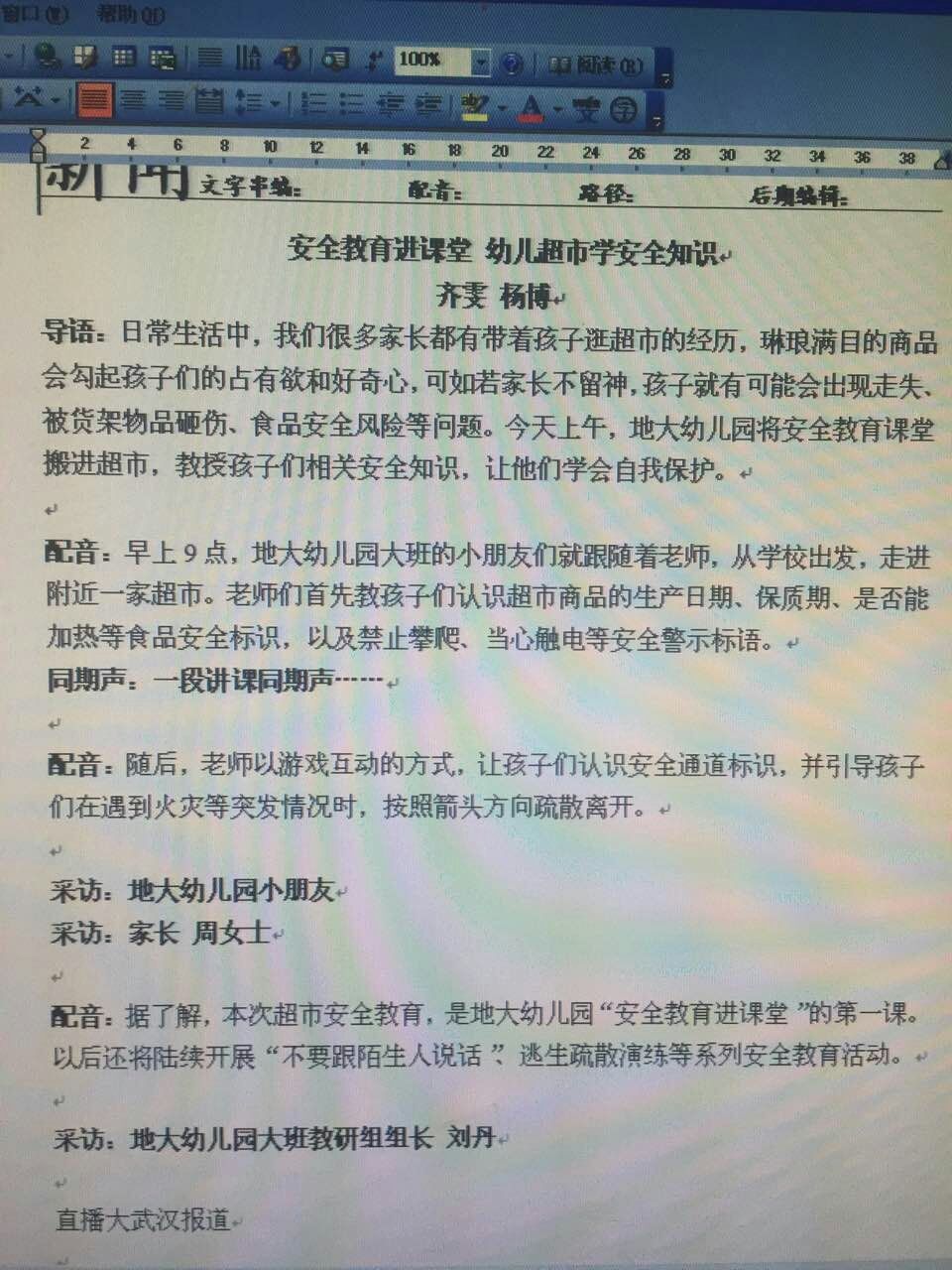 11月28日晚8点半,武汉六台的直播大武汉栏目播出了地大接待服务中心下属东区生活服务中心与地大幼儿园联合举办的幼儿安全教育活动的新闻。