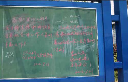 早上6点,院子里逐渐热闹起来,师生们开始陆续起床,提着大包小包的行李,到食堂就餐完毕,办理完退卡退宿手续后,有秩序的排队上车,实习站全体工作人员早已在大门口列队完毕,欢送实习师生离站。7点,随着大巴缓缓驶出,实习师生们离基地越来越远,黑板上只留下几行醒目的大字“实习师生感谢秭归实习基地全体工作人员的辛勤工作!” “三峡大学全体实习师生感谢地大秭归产学研基地全体工作人员辛勤的付出!”。