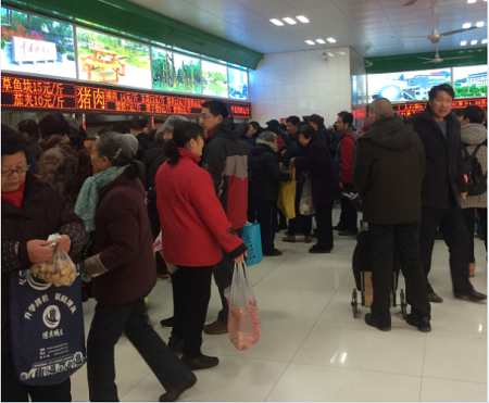展销会于21日上午9点开始,但教职工们早早排起了长队。展销期间会场内人声鼎沸、人头攒动,好一派迎新年的热闹景象!展销会上提供了肉、蛋、蔬菜、干货、大米、油等11个大类数百个品种的饮食物资,还有食堂师傅自制的鱼丸、肉丸、藕夹等熟食供应,极大的丰富了教职工的年饭餐桌。