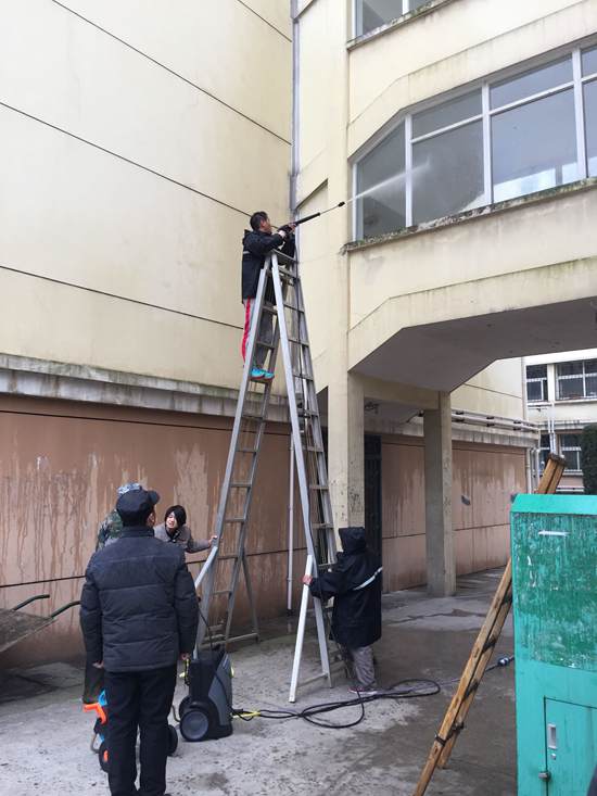 为了提升学生公寓楼内外整体环境卫生,给学生提供更舒适、更赏心的居住环境,3月17日,物业服务中心公寓服务部使用先进设备高压水枪,并邀请游泳馆专业技术人员指导帮助,对北二园区所有楼栋一楼墙面及楼梯间的玻璃进行了大清洗。