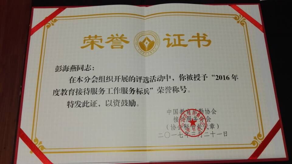 3月21日,在南京师范大学召开的中国教育后勤协会接待服务分会理事会一届三次会议上,我校后勤保障处接待服务中心员工彭海燕获“2016年度教育接待服务工作服务标兵”的光荣称号。