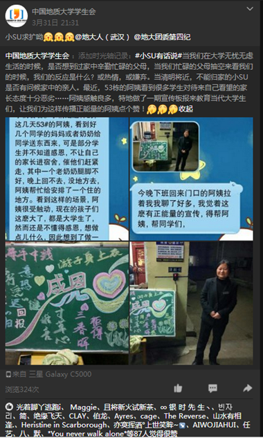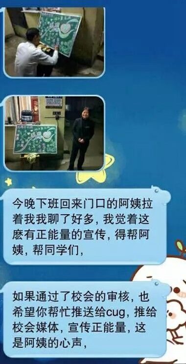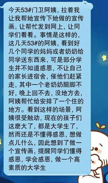 很多这样的事情她都看在眼里,身为2个孩子的母亲,她深切的感受到家长那种对孩子厚重的爱却不被孩子理解的痛苦。于是她特地请一个同学帮忙做了一块以感恩为主题的板报,并且只要有机会就向路过的学生宣传要感恩父母,尊敬家长,并让他们把板报在网上多多宣传,让更多的学生懂得感恩。于是同学们,校学生会纷纷转发,一位同学感慨道:“看到阿姨那种渴望希望又夹杂着痛苦与难过的眼神,深刻的感受到她为人父母那份厚重而透彻的爱,感动之余,庆幸自己对父母爱都来不及,哪里舍得去中伤那些爱我的人呢?”同学们纷纷被阿姨这种像母亲一样对学生殷切的希望和关爱的温情所感动,同时她积极宣传正能量的行为也赢得同学们集体点赞。