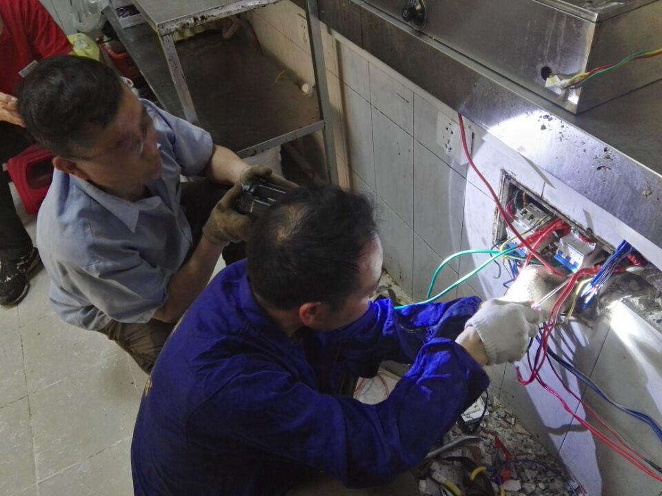 每逢节假日、双休日,当我们和家人一起安逸休闲的享受假期的时候,饮食服务中心维修组仍坚守岗位、严阵以待,随时随地准备处理各种突发事件,确保食堂的正常安全生产。4月里的一天,又是一个周日,学三食堂广东蒸菜窗口发生电路故障,周边几个窗口受其影响无法正常生产。接到报修,维修组值班人员迅速赶到现场,通过检查发现该窗口主电源线为暗线敷设,线路超负荷,其中两根火线烧粘连在一起,发生短路导致整条线路跳闸停电,由于故障点在墙内保护管中,需砸墙破管维修,因涉及面广,维修工作强度较大,为不影响食堂下午的正常生产营业,维修组全体人员放弃休息,加班维修,通过连续三个小时的紧张抢修,终于排除故障、恢复供电,圆满完成了这次的抢修任务。