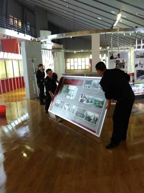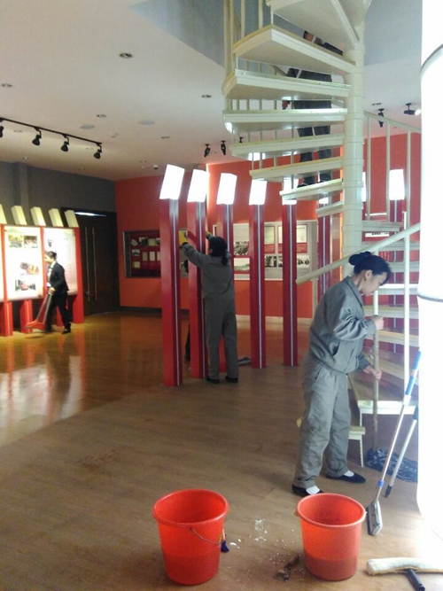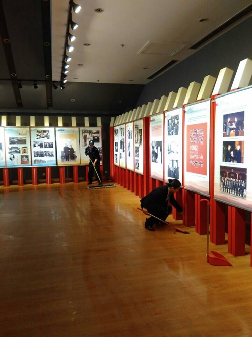 校史展厅平时并不对外开放,很多展品都重新布展,装饰,卫生细节是个大的挑战。一楼报告厅是阶梯式的,而且铺有地毯,平时每天都有大量学生来上课,清扫起来劳动量非常大。时间紧,任务重。场馆部调动人员,合理分配。一组员工清扫、擦拭五楼校史展厅;一组员工利用中午时间,使用两台大型吸尘机、加班加点做其余工作。游泳馆也伸出援助之手,安排两位员工和一台吸尘机前来支援。大家齐心协力、互帮互助,终于在活动开始前顺利完成任务。