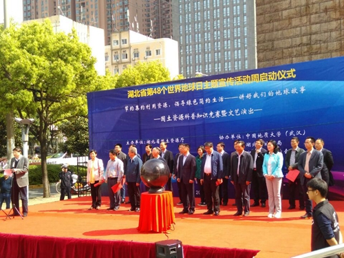 4月14日下午,省国土资源厅厅长张猛、我校校长王焰新等一行人参加了在中国地质大学逸夫博物馆举行的湖北省第48个地球日活动启动仪式。会议主题为普及地球科学知识,宣传矿产资源国情,展示我国节约利用资源,增强民众保护国土资源,保护环境,保护地球的意识。