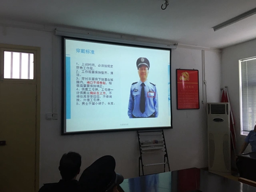 大楼服务部根据实际工作制作了简明易懂的PPT,由副经理向珏进行现场讲解。培训内容包含日常工作标准、交接班管理、日常登记要求、夜间巡逻要求、突发事件应急预案、员工宿舍管理规定六个方面,通过向大家展示标准的和错误的工作方式,对保安员日常工作开展规范化管理培训。培训内容直观、易懂,深得大家认同。