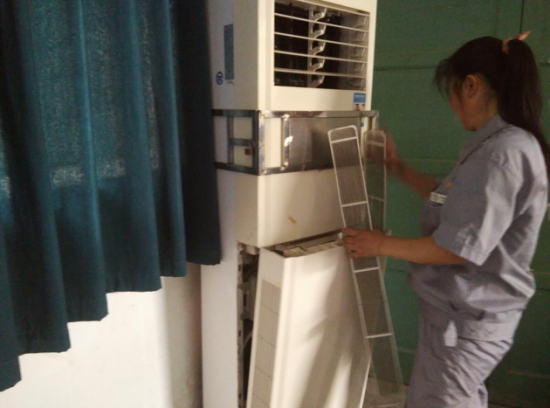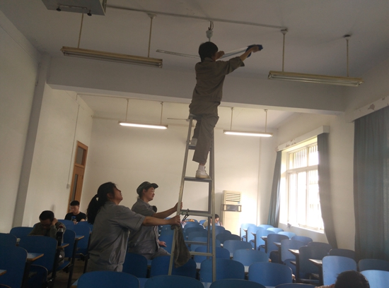 五月的天,正值春末夏初。天空沉静,草木欣然。为了迎接即将到来的暑夏,教学楼内的避暑装备即将全面启用。物业服务中心教学服务部的保洁阿姨牺牲休息时间,利用五一假期楼内学生稀少的时候,把教室内所有的电扇和空调过滤网进行了认真彻底的清洗除尘。空调过滤网的除尘,可以有效的减少病菌的传播和提高空调的使用效果。为师生营造了健康舒适安全的教学环境。在全面提倡环保的大环境下,教学服务部努力为节能环保出尽一份力。
