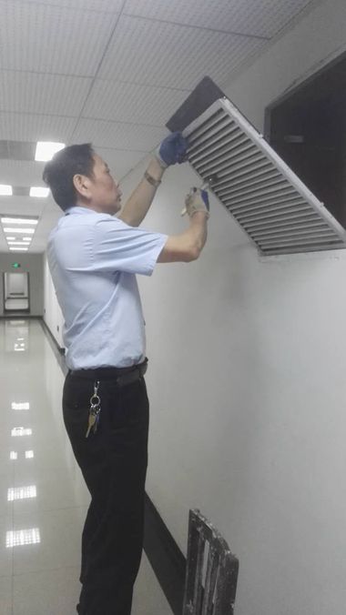 首先,对基委楼的空调机组的过滤网、百叶窗进行了清洗。清洗好后恢复成整机,再对电路进行了仔细检查,并进行了试机工作,为今年高温天气作准备。另外在校园服务部的协力帮助下,同时对室外机周边的场地进行了除草,保证周边的环境卫生。