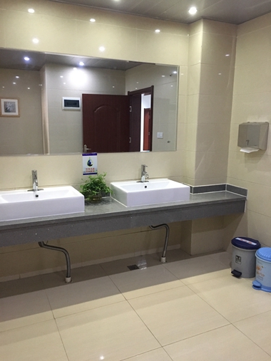 首先,在主楼大厅悬挂中国风山水画,为庄重严肃的办公楼增添了一丝人文色彩;其次,通过与学院的反复沟通协商,部门与学院之间相互配合,针对部分楼层的卫生间进行升级改造。在洗手间安装静物画。在改善采光的同时,调节沉闷气氛、营造了艺术氛围。与此同时,部分卫生间安装了精致的不锈钢纸巾盒,提升了物业服务品质。光洁的镜子,映出绿色盆栽也格外清新,扫除了大家对卫生间的刻板印象,给师生耳目一新的感觉。第三,在五月中旬,为提高办公楼内部整洁度,大楼服务部撤除了部分敞口式的垃圾桶,取而代之更换了统一美观的脚踩式带盖垃圾桶,这体现了在硬件设施配置上,又提升了一个台阶。虽然对于员工来说,之前的垃圾桶更容易操作,但是为了给学校师生提供优美的工作环境,我们也在不断的提高工作要求。