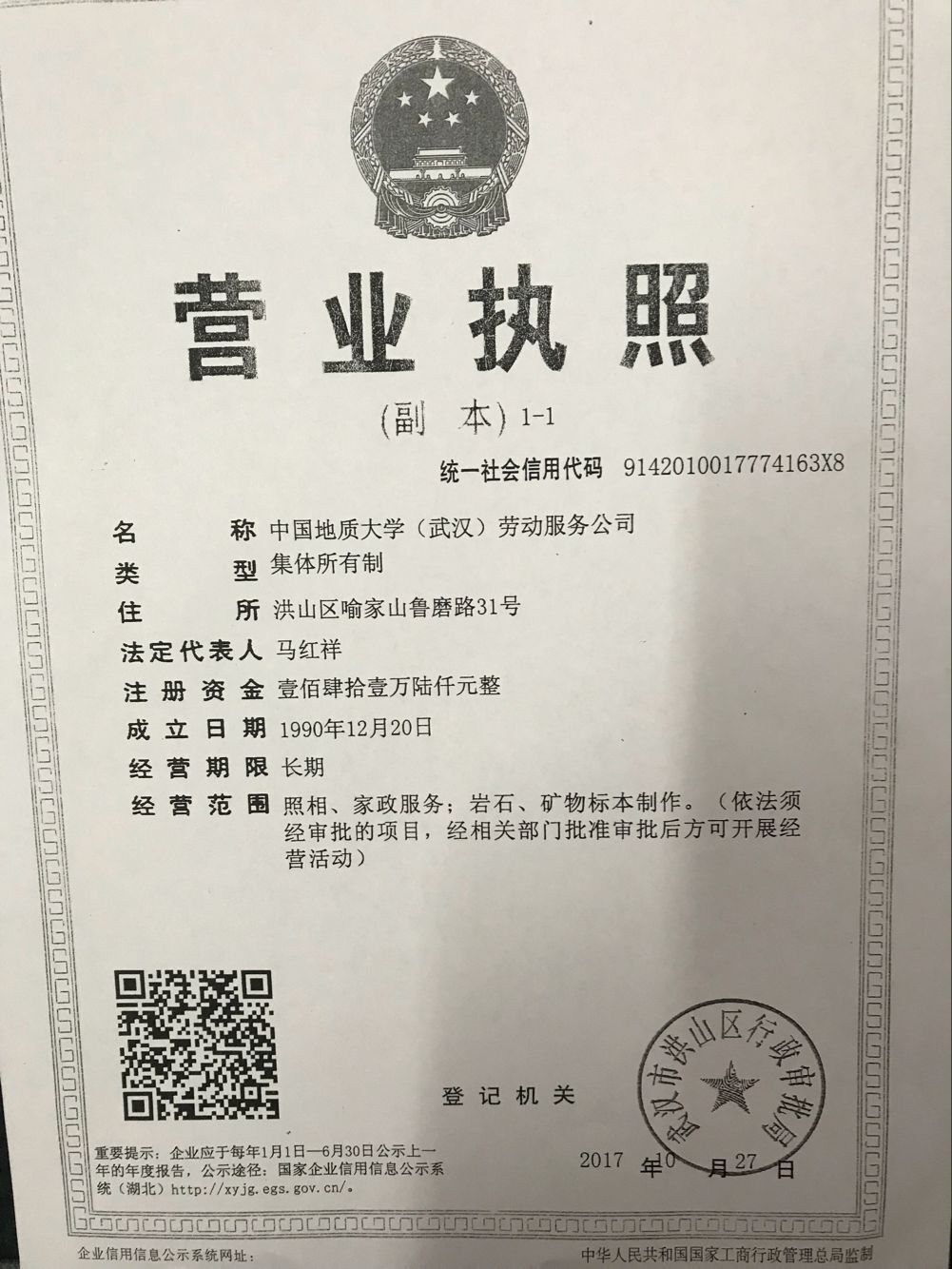 按照国家工商总局贯彻落实《国务院办公厅关于加快推进“三证合一”登记制度改革的意见》的通知,劳动服务公司原来的营业执照、组织机构代码证、税务登记证合为一证,即“三证合一”。“三证合一”登记制度是指企业登记时依次申请,分别由工商行政管理部门核发工商营业执照、组织机构代码管理部门核发组织机构代码证、税务部门核发税务登记证,改为一次申请、合并核发一个营业执照的登记制度。劳动服务公司高度重视此项工作并迅速部署落实,安排专人负责此项工作。在按照相关程序完成各种办事流程之后,历时近一年,于2017年10月27日在洪山区政务服务中心工商管理局更换到了新的营业执照。