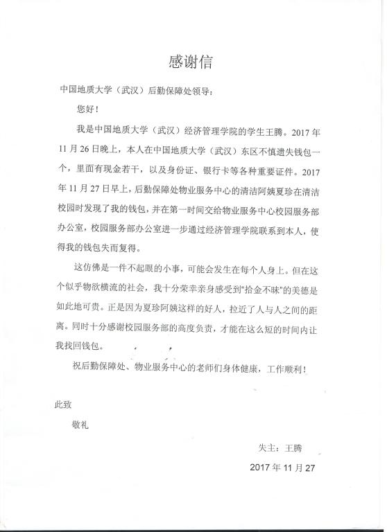 经管学院王腾同学拿到钱包后,立即写信致谢了夏珍师傅,对夏师傅这种拾金不昧的行为表示感谢,同时对物业服务中心高度责任感和高效率服务也给予了肯定。