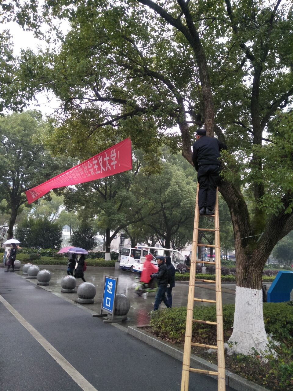 我校即将迎来中国共产党第十二次代表大会的召开,物业服务中心校园服务部接到紧急任务,负责党代会期间我校各区重要路段12条横幅的悬挂工作。时间紧任务重,1月23日,气温骤降,因雨大风急,悬挂好的横幅断裂,员工立刻安排破损的横幅连夜重做,未悬挂的横幅用针线自行加固。24日一早,雨雪交加,路面湿滑,横幅悬挂工作困难重重,部门负责人带领员工冒着雨雪,搭着梯子,爬到树上绑铁丝、挂横幅,无惧雨雪坚守岗位的敬业精神获得来往行人的一致称赞。