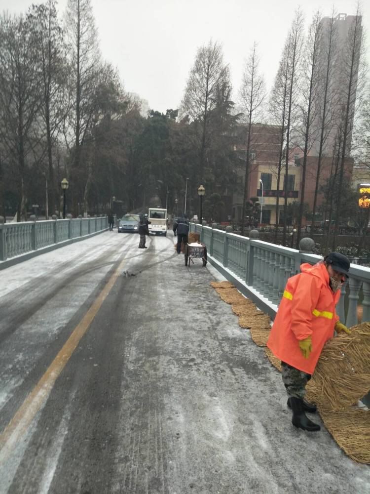 除对主干道的积雪清理工作之外,校园服务部还对易滑路面,如西区图书馆前绿化广场、北区亲水平台路面,均拉上警戒线放上提示牌,红军桥等结冰路面铺设草垫和麻袋。在此也提醒各位师生及家属,天冷路滑,小心慢行。
