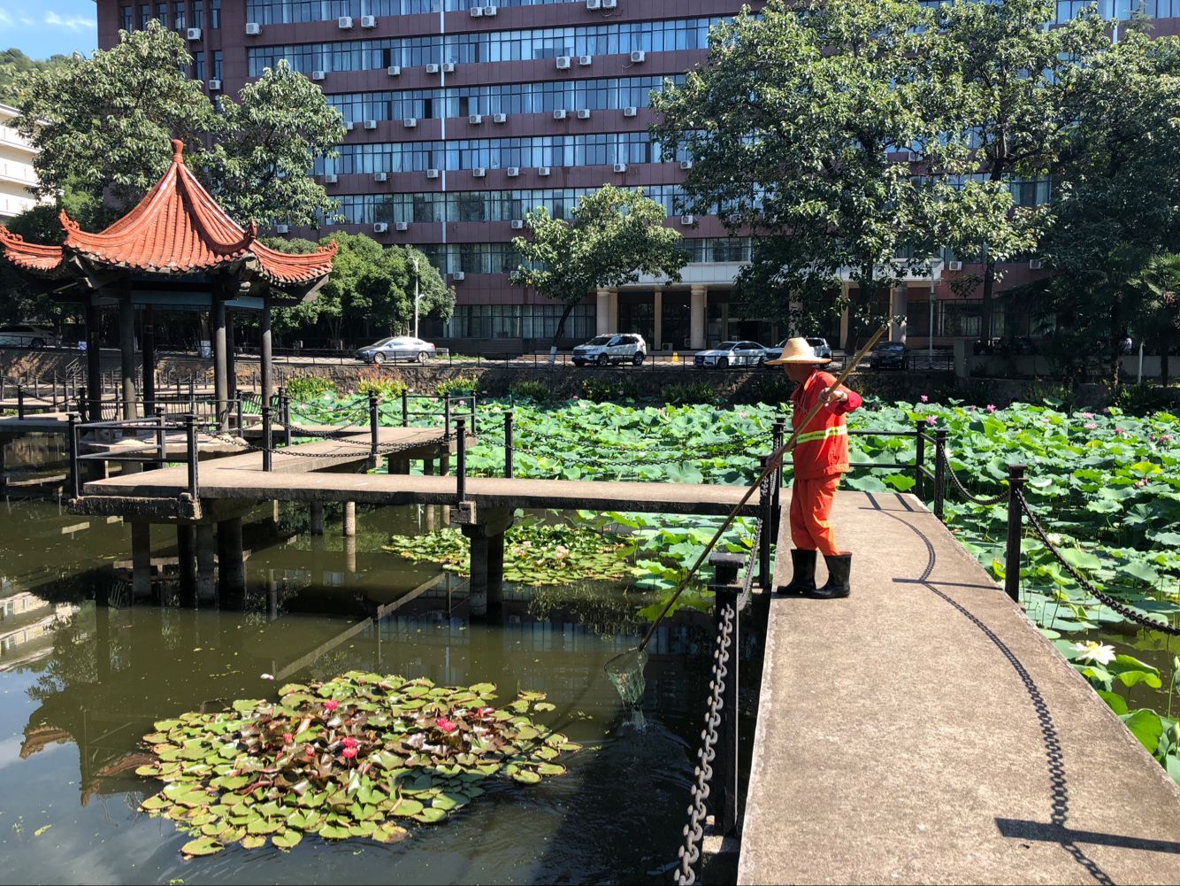 7月中旬,武汉市进入酷暑三伏天,37度的高温天气愈演愈烈,但有一群人依然在烈日下坚守岗位,汗流浃背的工作。为了校园环境的整洁和美丽,物业服务中心一天四次的清理果皮箱和下沉垃圾站,每天早晚给全校的绿地树木浇水,定期清理景观水面避免蚊虫滋生。