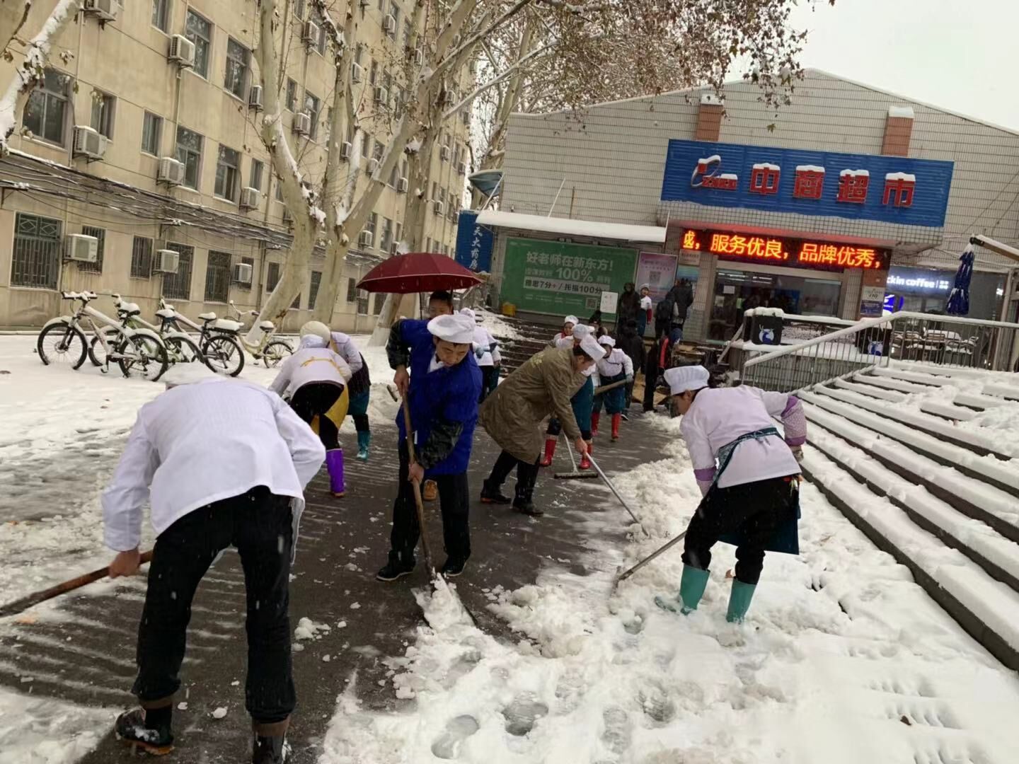中心领导也都放弃休息,分赴各食堂指导、协调应对恶劣天气的各项工作,并和食堂员工一起奋战在除雪、防滑、防冻一线。正是大家齐心协力、顶风冒雪,凭借着高度的责任感和主人翁意识,给就餐师生开辟一条条平稳道路。