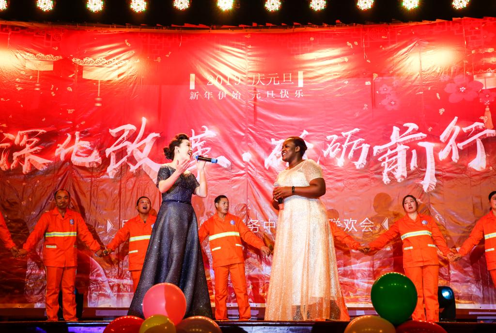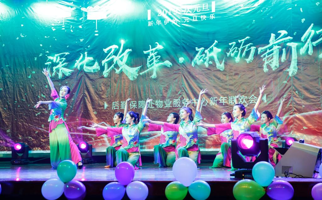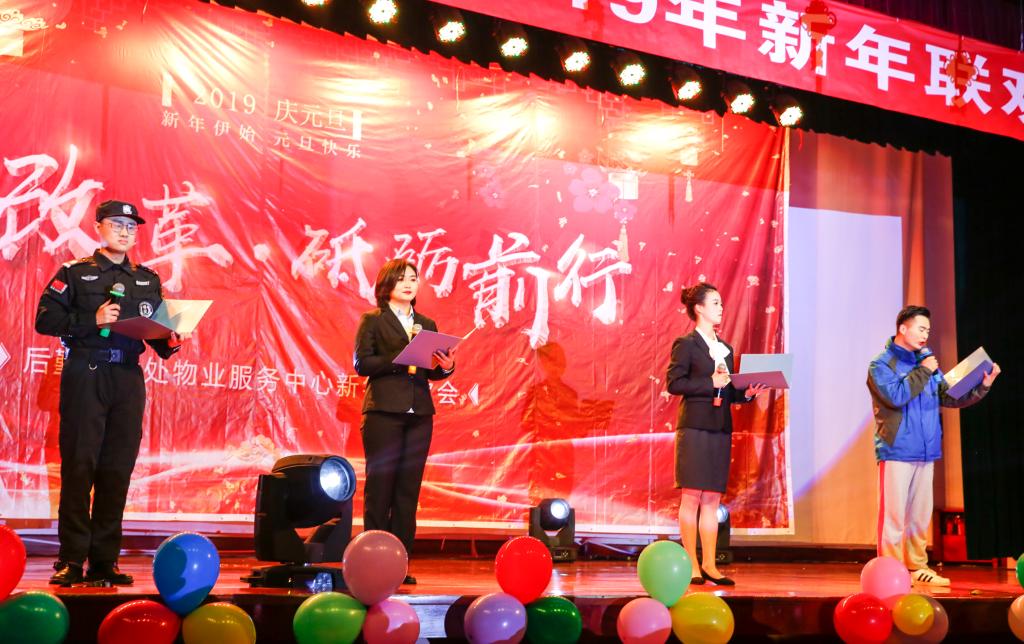 晚19:00,大学生活动中心灯光灿烂,舞台上方悬挂着横幅:深化改革,砥砺前行!舞台幕布上播放着物业人的日常工作照,铺展出他们闪亮的工作状态。“锣鼓敲起来,张灯又结彩,喜气洋洋,扑面而来。四面在摇摆,八方乐开怀,龙凤呈祥,好戏连台。”歌舞《中国喜事》拉开整场晚会序幕。