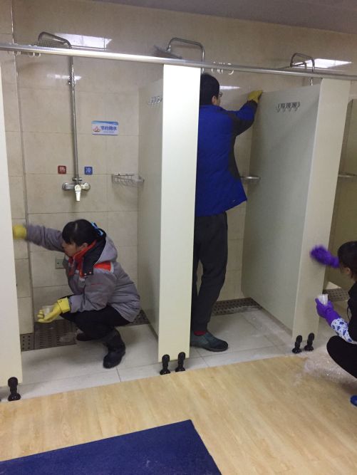 馆内深度保洁,打造健康环境。游泳馆面积不大,但清洁起来工作量并不小,尤其浅水区,几百块垫板需要一块块从池区抬出来清洗,垫板下的区域被分隔成若干个不足一平方米的大小方格,穿梭于这些“九宫格”中清洁,需要不断“跨栏”,作业难度非常大;水线因长期浸泡在水里,难免有水垢残存,需要一个个刷洗干净;泳池循环沟内排水管直接通往设备间精滤机,为防止长期流水形成的水垢堵塞管道、损坏精滤机,需要一个个疏通清理;池区排水沟沟盖板的清洁、淋浴间内排水沟的清理、浴帘的清洗、淋浴杆及扶手等不锈钢设施的保养、下水道的疏通、天花板及墙面的清洗、防滑地垫的清洗,工作纷杂且繁多。