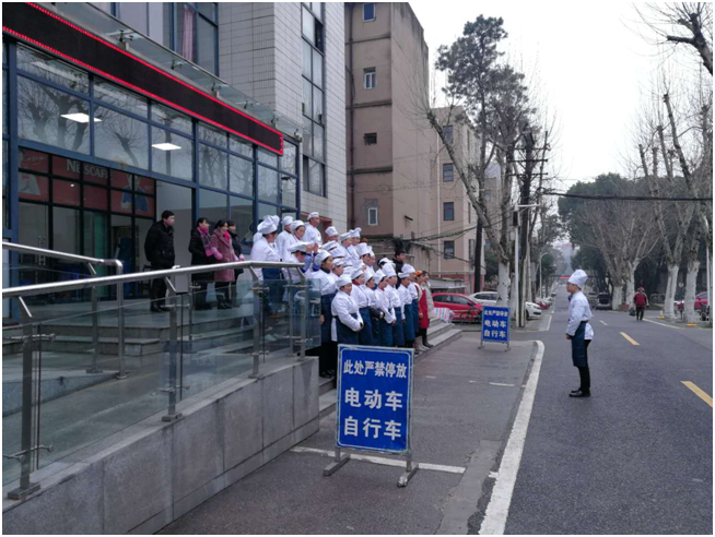 员工统一更换了新服装,红白案档口换上了干净整洁的白色厨师服,卫生班员工也更换了马甲式工作服,带上清洁的腰带,放置消毒水、抹布、纸巾,十分规范化和专业化。