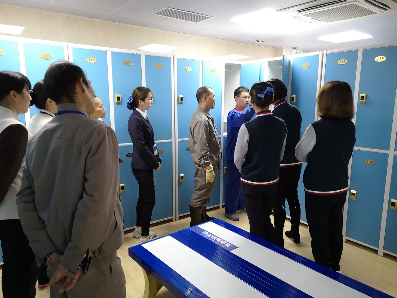 更衣柜清洁培训以经验丰富的保洁师傅现场边讲解边操作示范的方式进行开展。讲解示范完成后,员工之间相互讨论各自所使用的方法,实际操练对比不同方法的优劣,总结并规范统一清洁更衣柜的流程,实现标准化管理。
