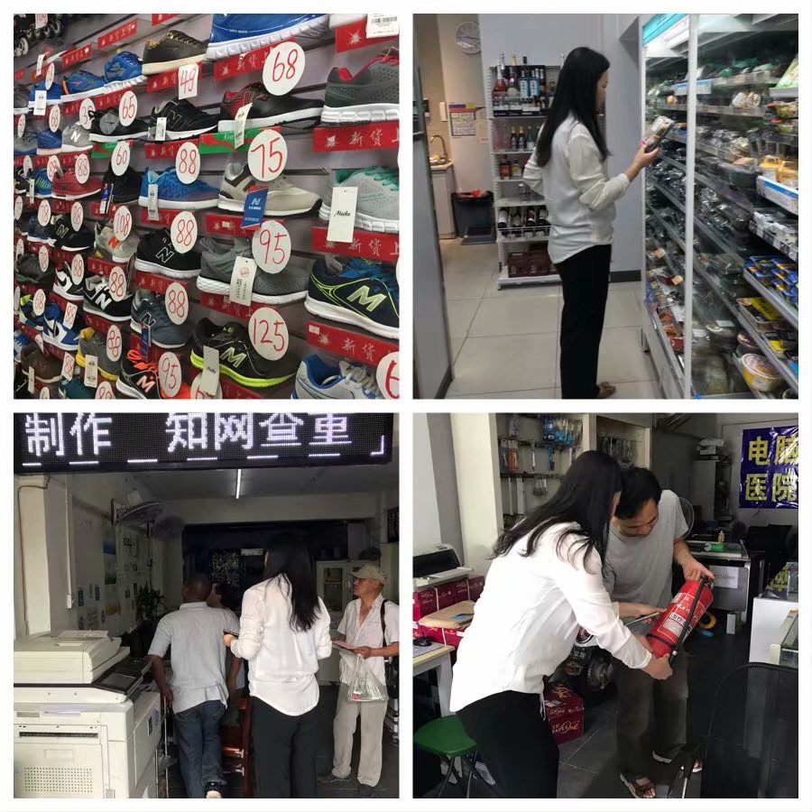 一组检查组由公司经理傅艾平、商务服务部经理李辉带队对学校北区商业门面进行了检查,在检查过程中总体情况较好,但有个别门面门前卫生不干净,门头有蜘蛛网,一组工作人员现场让商户做了打扫处理。二组由党支部书记黄晶晶、办公室主任胡靓带队对学校东区商业门面进行了检查,在检查过程中,工作人员逐一检查了灭火器,发现商户灭火器大多都是今年6月份到期,公司已与保卫处进行了联系并统计了灭火器更换数量,这个月将进行统一更换。三组由公司副经理姚红莲、商务服务部副经理吴红莉带队,对学校西区门面进行检查,总体情况较好,其中武汉市美克服装店店主各种物品明码标价排列整齐、清楚、规范,对于表现较好的商家,工作人员现场也提出了表扬。