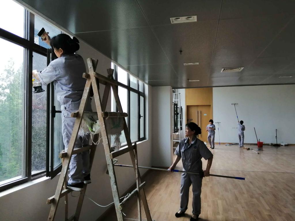 仪式当天,新综合楼服务部开荒团队便入驻珠宝大楼,经过四个小时的突击作战,他们以最高的效率、最优的质量完成了一楼与四楼的开荒工作,为当晚珠宝学院首届服装首饰大赛的举办做好充足的准备。