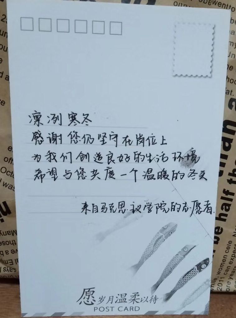 “凛冽寒冬,感谢您仍坚守在岗位上,为我们创造良好的生活环境,希望与您共度一个温暖的冬天。”12月8日,教学综合楼的保洁员汪小平师傅正在清扫花坛,马克思主义学院的一名学生走上前来,对汪师傅表示关心,送上了这样一张明信片。寥寥几句话却描绘了学生对物业服务中心基层员工的认可及感谢。