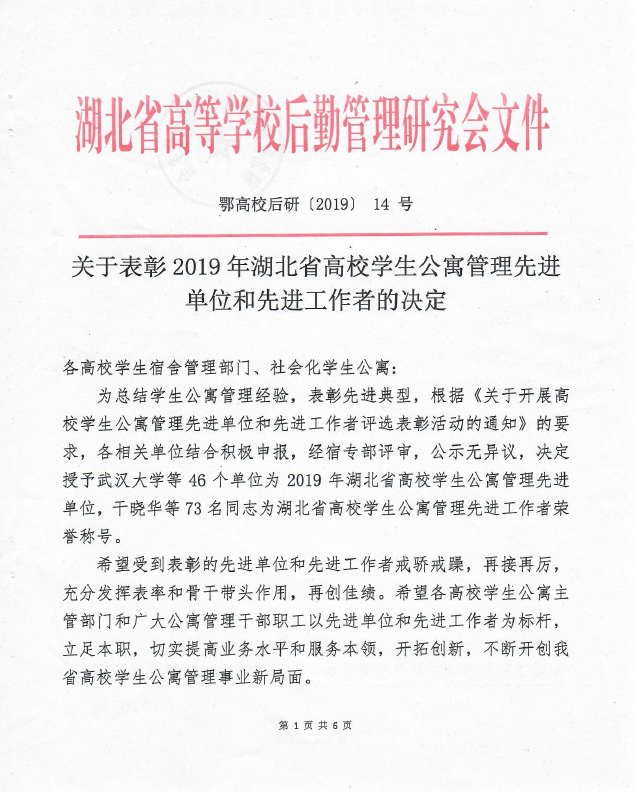 12月6日,湖北省高等学校后勤管理研究会发文表彰2019年度湖北省高校学生公寓管理先进单位和先进个人。我校学生住宿服务中心被评为“2019年湖北省高校学生公寓管理先进单位”,中心副主任张红兵、住宿服务部经理干晓华被授予“2019年湖北省高校学生公寓管理先进工作者”荣誉称号。全省共有46所高校的学生宿舍管理部门、73名同志获评先进单位和先进个人。