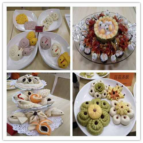 冬至活动分为两部分进行。首先是“面点大当家”现场投票评选环节。我中心员工以食堂为单位参加此次面点大赛,为了迎接比赛,员工们提前数天就开始精心筹备,调色、雕刻、塑形,使出了浑身解数将造型各异、形态逼真的花式面点作品呈现在我们面前。其中,有寓意吉祥,名为“花开富贵”“节节高升”等的面点样式,有小鸡、小猪、小鱼等憨态可掬、灵动可爱的萌宠造型面点,还有各种颜色、栩栩如生的寿桃包子,我们饮食员工们的“绝活”引得参与活动的师生啧啧称赞。经过现场投票,东苑餐厅参赛团队获得面点大当家荣誉称号,学一食堂参赛团队获得最佳创意奖。