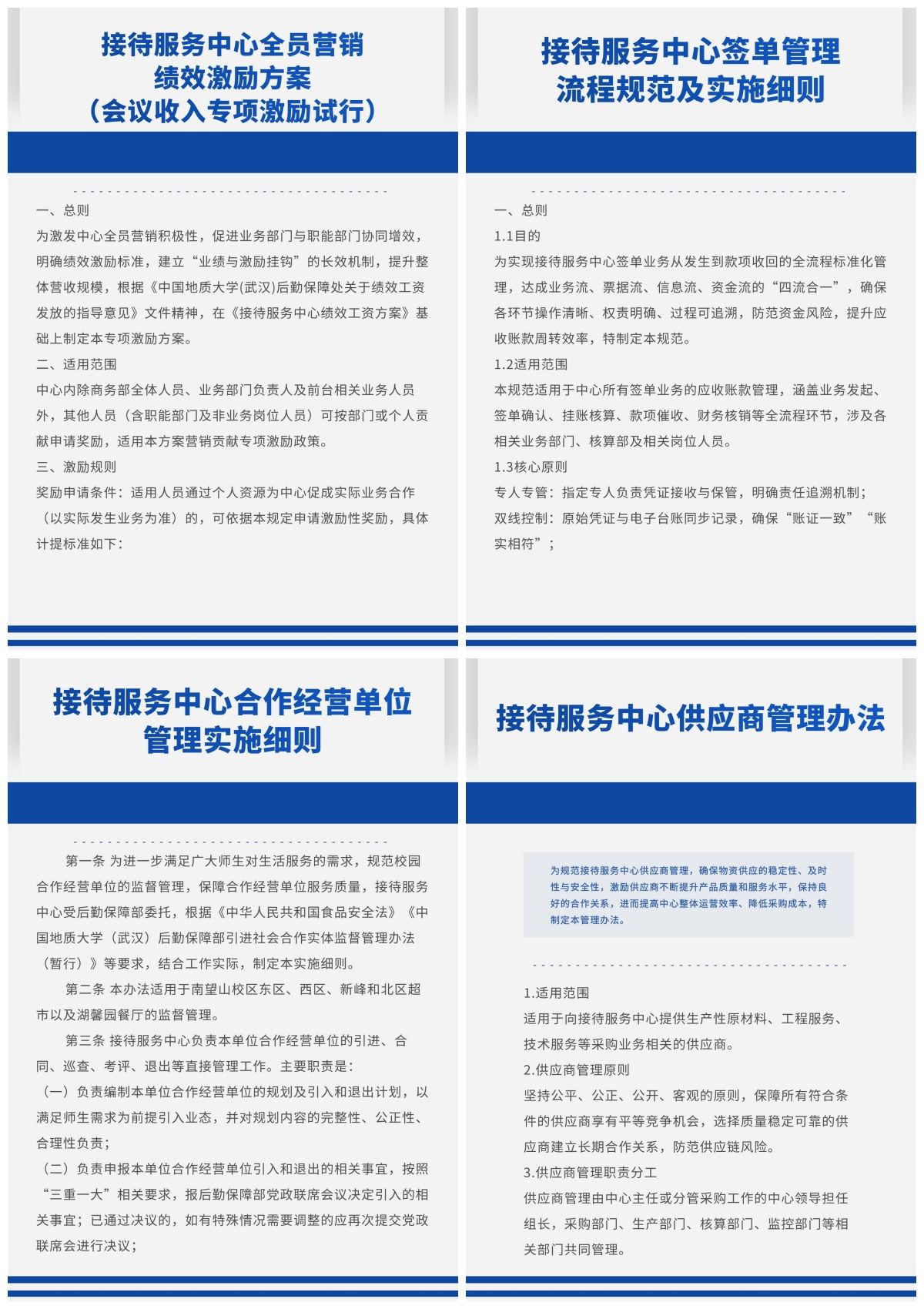 为进一步提升中心经营管理效率,规范各项业务管理流程,持续激发发展活力,接待服务中心立足师生需求与校园接待服务发展实际,于近日出台《接待服务中心全员营销绩效方案(会议营销专项激励)》(试行)、《接待服务中心签单管理流程规范及实施细则》《接待服务中心供应商管理办法》三项新管理制度,同步修订《接