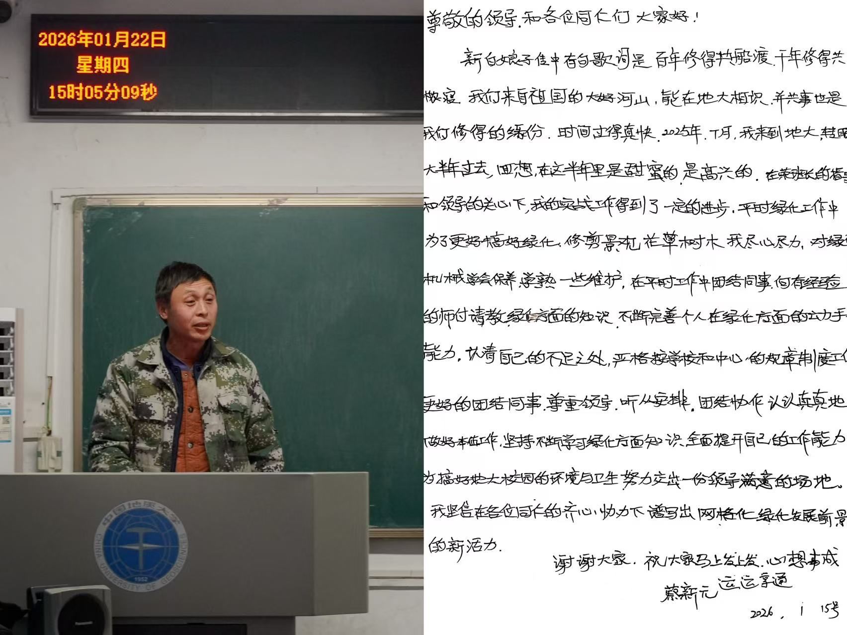 岁序更替,华章日新。正值学校复盘过往成效、锚定十五五规划蓝图、谋划高质量发展的关键阶段,物业服务中心近日召开年终总结大会,在员工代表发言环节,来自环卫绿化、保洁、秩序维护等不同岗位的员工代表,立足日常工作实例,用最朴实的话语、最真挚的情感,讲述扎根岗位、默默耕耘的服务故事。环卫绿化班组陈代