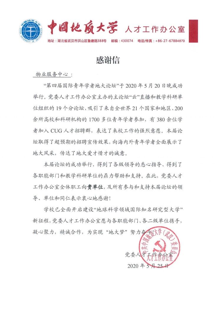 5月25日上午,物业服务中心收到中国地质大学(武汉)委员会人才办公室的一封感谢信,对物业服务中心在“第四届国际青年学者地大论坛”活动期间提供的帮助和支持,表示感谢。据了解,物业服务中心为做好此次保障工作,活动前期制定工作方案,完成场地消杀、场地布置、设备调试、网络试播等工作;活动现场做好人